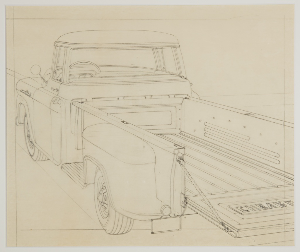 John Chilka created these Chevrolet truck drawings during his time as a designer in the Art & Colour division at General Motors. Both designs are examples of “final tissue” drawings, which were made for transferring the outline of a work to an illustration board for presentation. Because these were produced at a later stage of the creative process after many earlier studies, final tissue drawings represent more finalized versions of designs rather than experimental concepts. After transferring these images to a new support, Chilka would then have used gouache or airbrush to prepare the presentation drawing. These examples of Chevrolet trucks demonstrate the range of features available on various vehicle models.