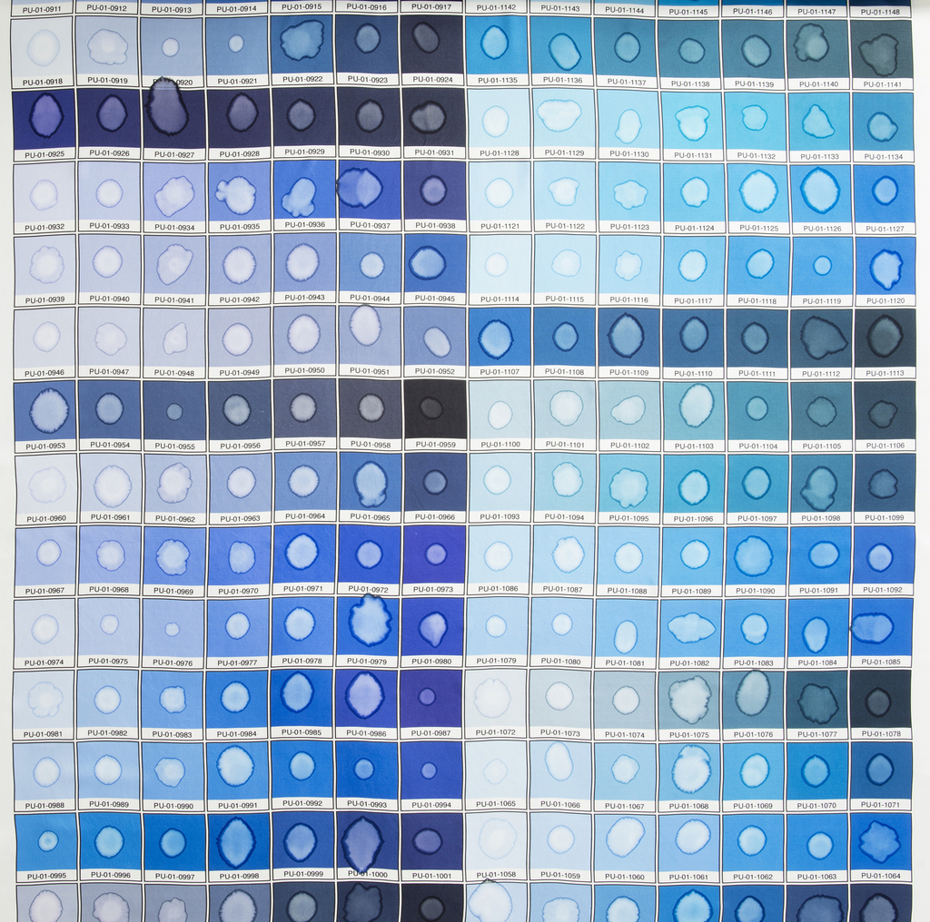 In preparation for creating textile patterns using rainfall, Aliki van der Kruijs created this sample blanket that explores how digital printing inks respond to water before they are fixed with heat. A range of shades and tints are created as dye is lifted and deposited along the tide lines.