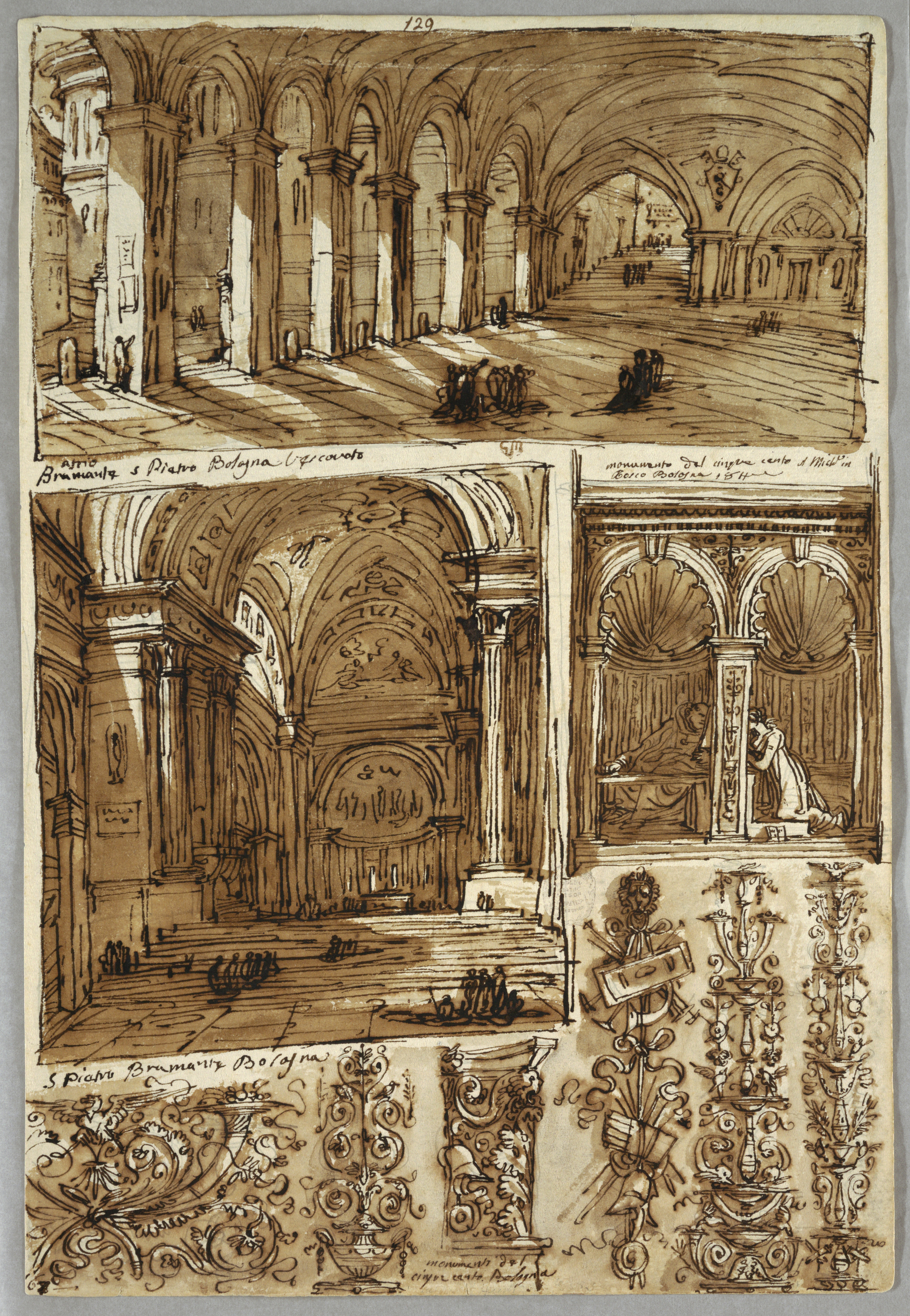 Drawing, Sketchbook Page: Atrium, San Pietro, Bologna and Detail from San Pietro; Detail from S. Michele in Bosco; Verso, Geometrical Studies of Heads; Designed by Felice Giani (Italian, 1758–1823); Italy; pen and brown ink, brush and brown wash over traces of graphite on laid paper; 37.4 x 25.5 cm (14 3/4 x 10 1/16 in.); Museum purchase through gift of various donors; 1901-39-2195