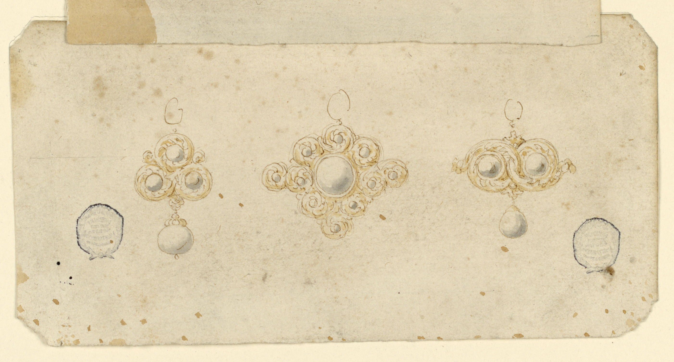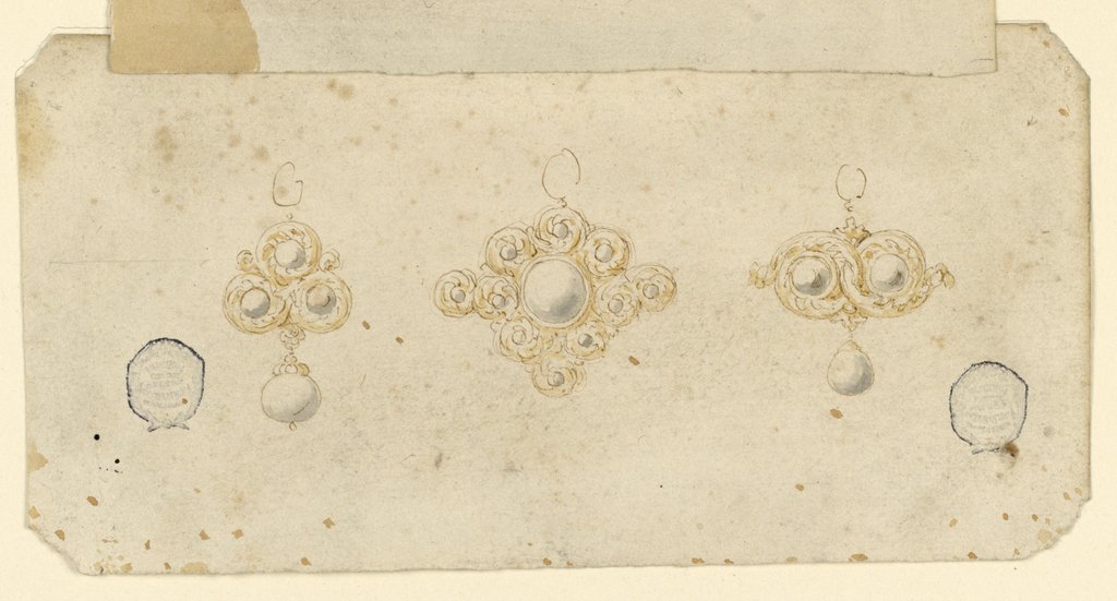 Drawing, Design for Three Pendants with Rinceaux; Italy; pen and ink, brush and watercolor, sepia on paper; H x W: 22 × 11.1 cm (8 11/16 × 4 3/8 in.); Museum purchase through gift of various donors; 1901-39-769