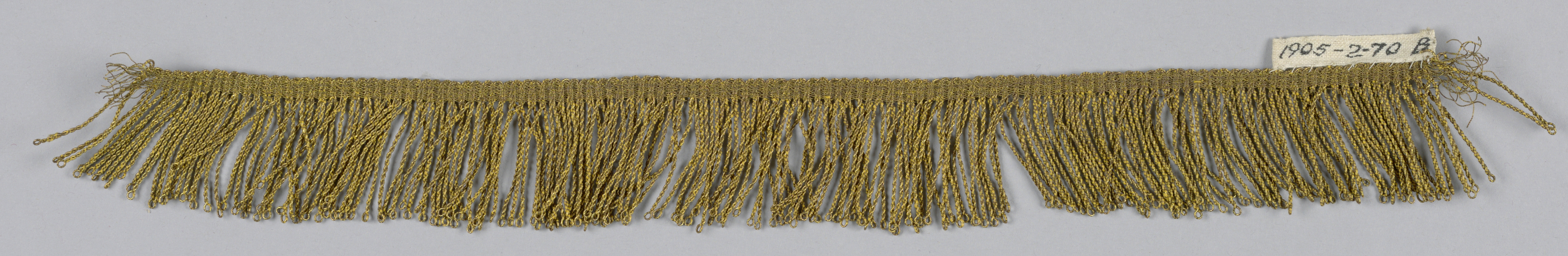 This is a Fringe. It is dated 18th century and we acquired it in 1905. Its medium is gold foil in a silk core and its technique is woven. It is a part of the Textiles department.