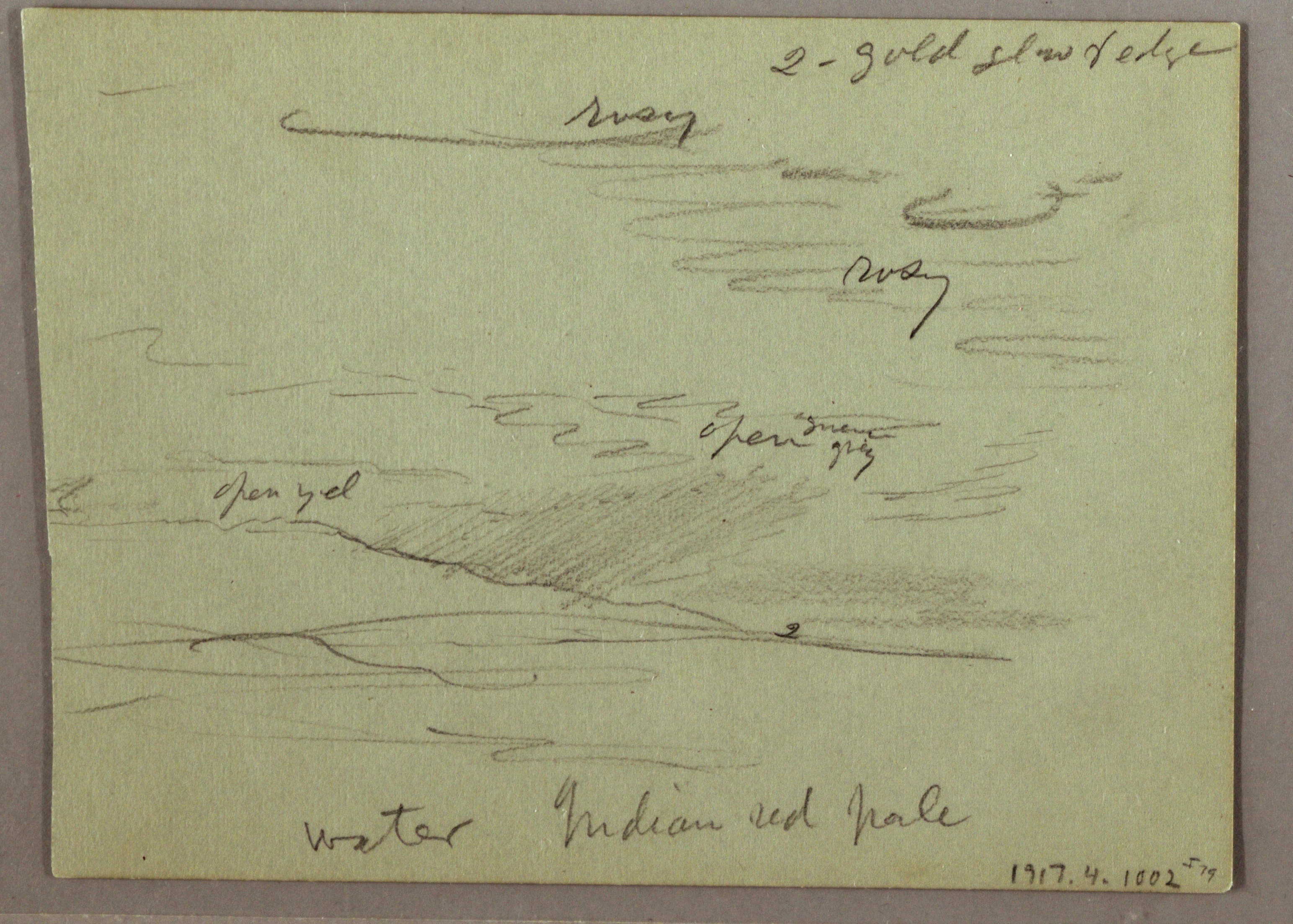 Inscribed in graphite, upper left: Last peak (south) of Catskill / sunset Dec 22d / 1870; verso upper center: rosy; upper right: 2 - gold glow & edge; center left: open yel; center right: green / open grey; lower margin: water Indian red pale