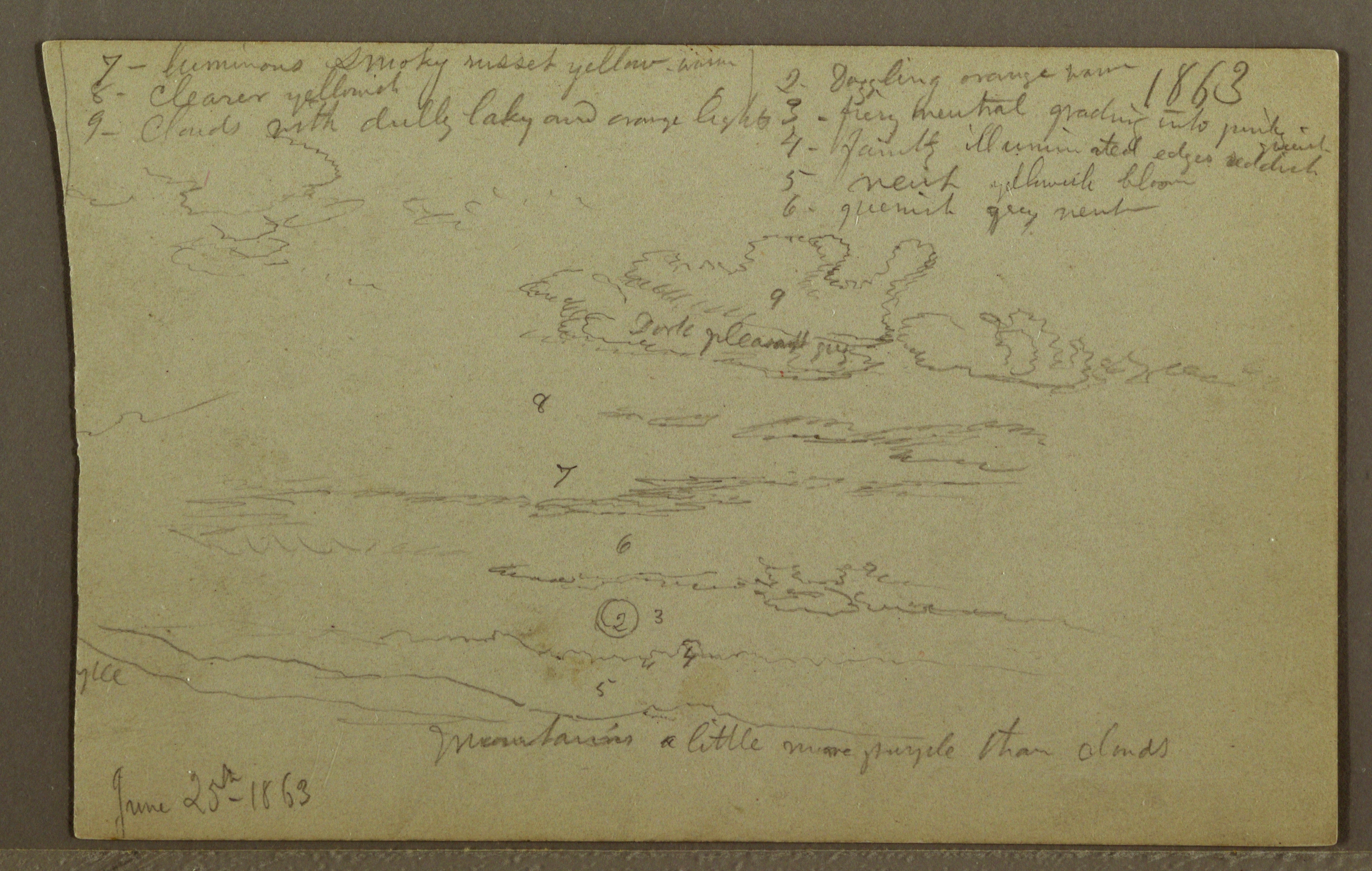 Inscribed: in graphite, upper left: 7 - luminous smoky russet yellow, warm / 8 - clearer yellowish / 9 - Clouds with dully lakey and orange lights; in graphite, upper right: 2 - Dazzling orange warm / 1863 / 3 - fiery neutral grading into pinky & greenish / 4 - faintly illuminated edges reddish / 5 - neut yellowish bloom / 6 - greenish grey neut; in graphite, center: 9 / Dark pleasant grey / 8 / 7 / 6 / 3 / 2 3 / 4 4 / 5; in graphite, lower left: [Van D]yke [?] / June 25th - 1863; in graphite, lower center: mountains a little more purple than clouds; in graphite, verso center: cool / orange