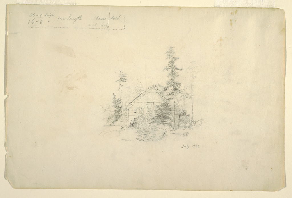 Drawing, Log Cabin, Catskill, New York; Frederic Edwin Church (American, 1826–1900); USA; graphite on off-white wove paper; verso: graphite; 25.7 × 38.6 cm (10 1/8 × 15 3/16 in.); Gift of Louis P. Church; 1917-4-1034