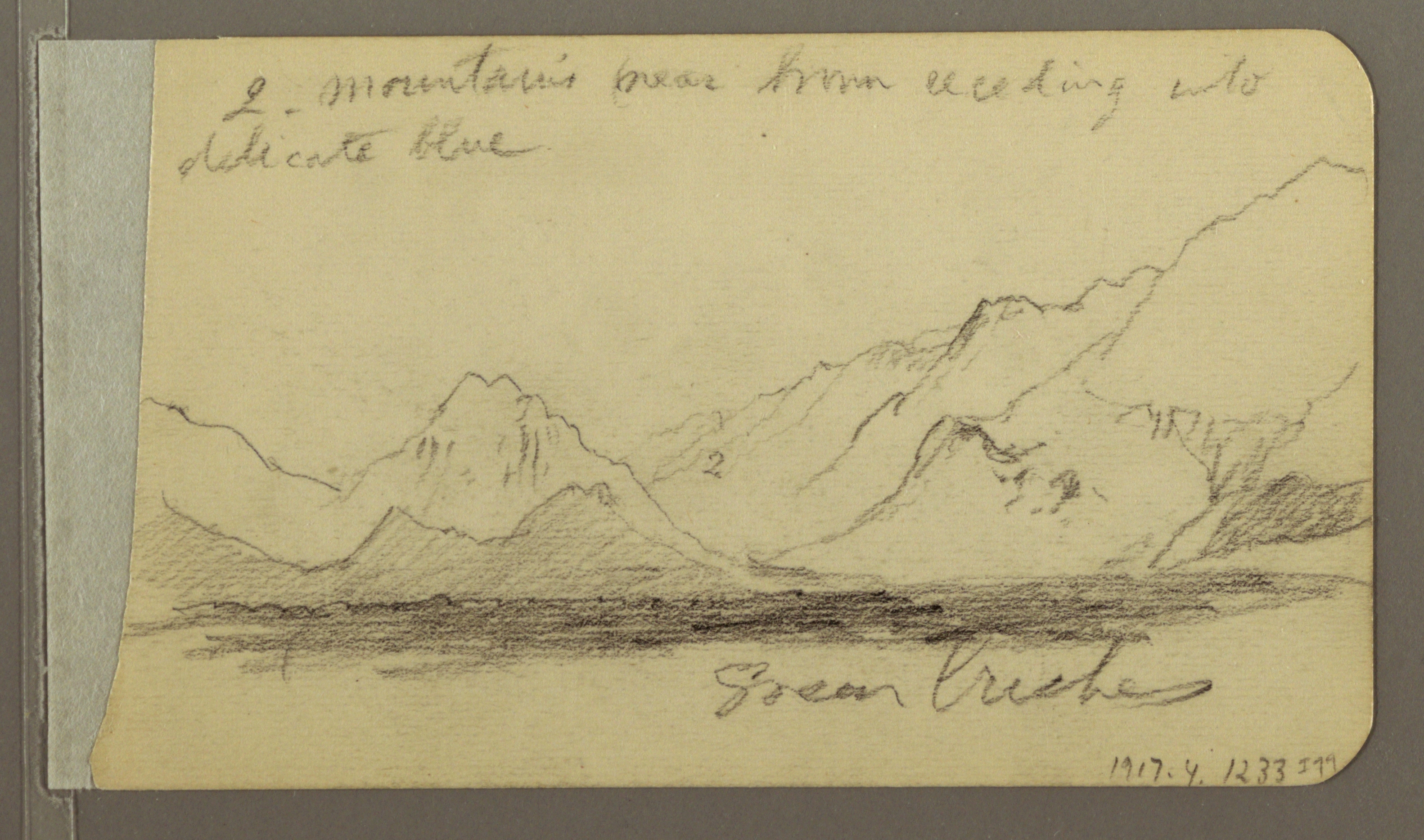 Inscribed: in graphite, upper margin: 2 - mountains near brown receding into / delicate blue; in graphite, center: 2; in graphite, lower right: green bushes