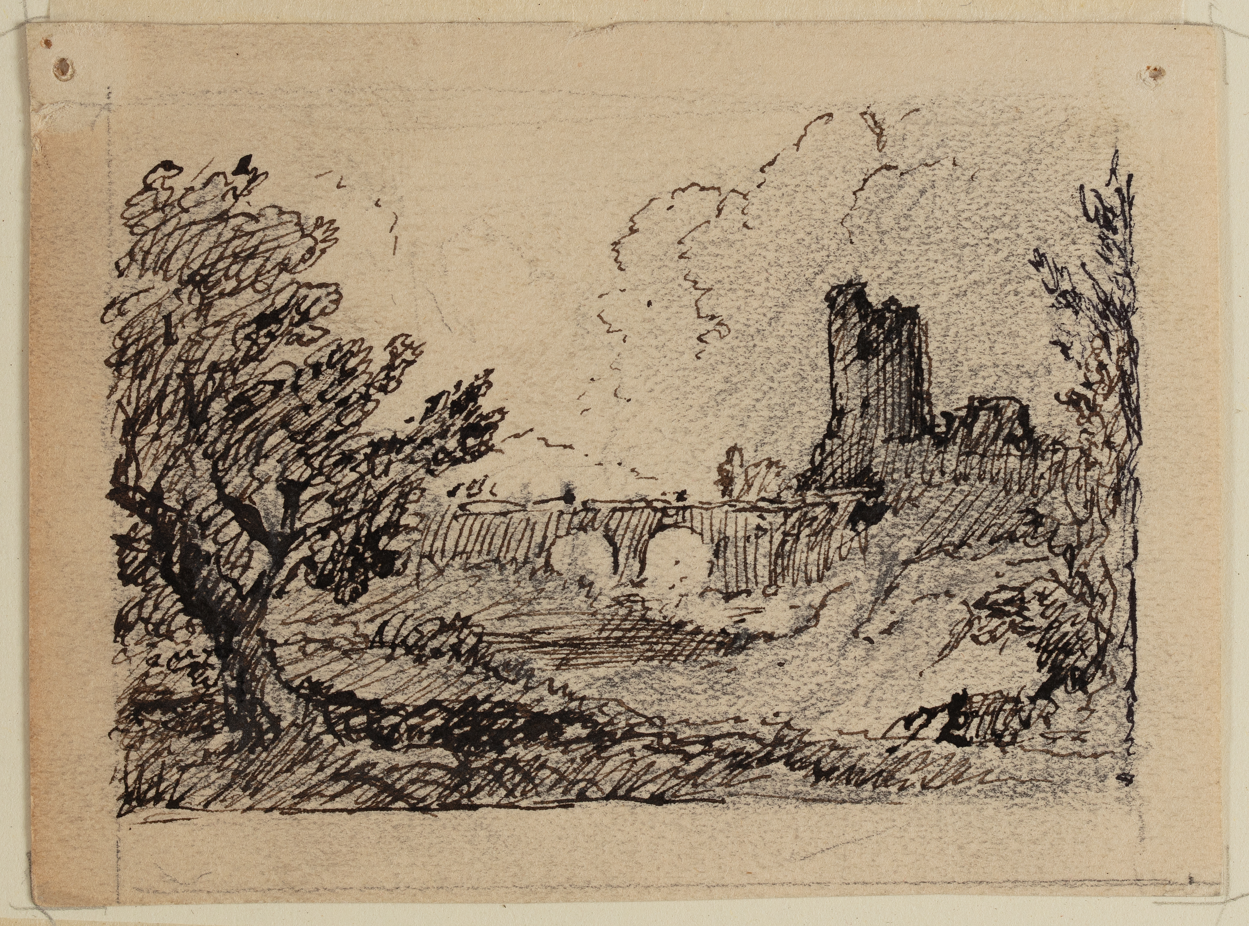 Drawing, Imaginary Landscape with Ruined Tower and Bridge; Frederic Edwin Church (American, 1826–1900); Attributed to Thomas Cole (1801 – 1848); USA; pen and black ink, rubbed graphite on off-white wove paper; 6.4 × 8.5 cm (2 1/2 × 3 3/8 in.); Gift of Louis P. Church; 1917-4-529