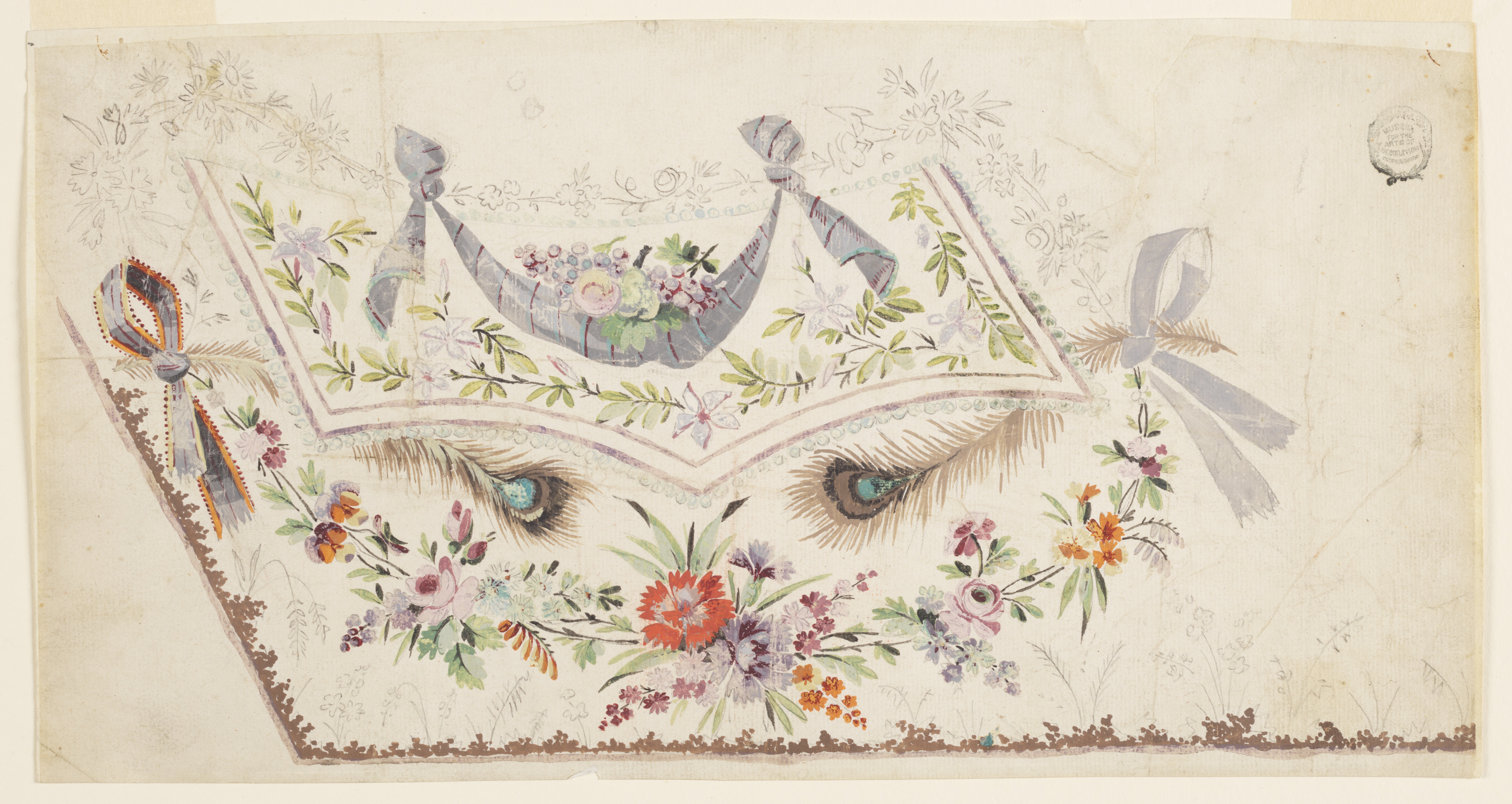 Drawing, Design for the Embroidery of a Man's Waistcoat of the Fabrique de St. Ruf; Designed by Fabrique de Saint Ruf; France; graphite, brush and gouache on paper; 18.9 × 35.7 cm (7 7/16 × 14 1/16 in.); Gift of Eleanor and Sarah Hewitt; 1921-22-231
