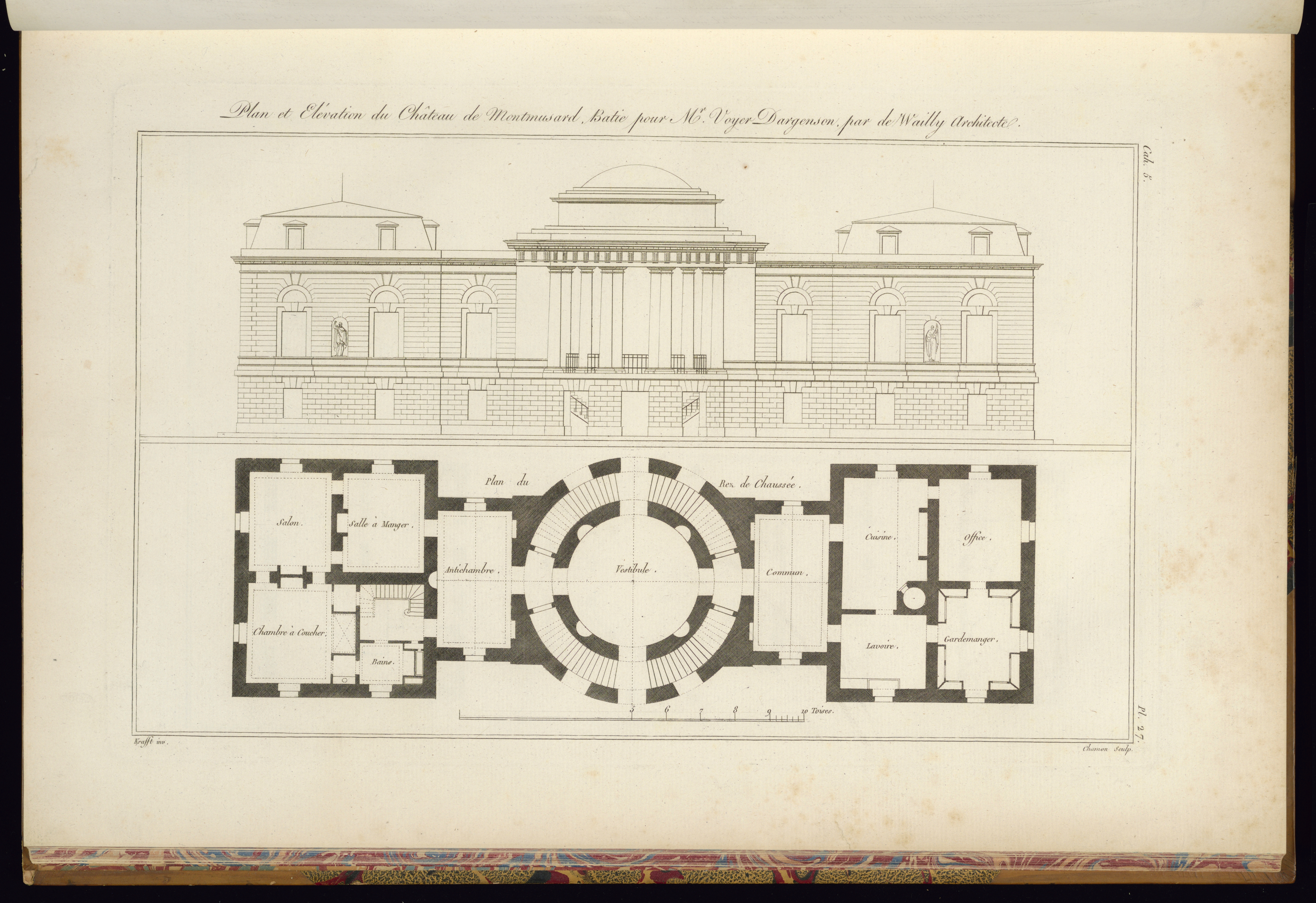 Print, Plan et Elévation du Château de Montmusard, Batie pour Mr. Voyer Dargenson par de Wailly Architecte; Architect: Charles de Wailly (French, 1730–1798); Designed by Jean-Charles Krafft (French, 1764 - 1833); Printed by Adrien-Georges Crapelet (French, 1789 – 1842); Published by Jacques Louis Bance (French, 1761 – 1847); Calligrapher: Demoiselle Vallet (French, active 1801 – 1812); Print Maker: Chamon (French, active early 19th century); France; etching and engraving on paper; Purchased for the Museum by the Advisory Council; 1921-6-552-28