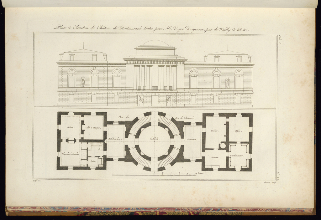 Lettered in plate upper center: Plan et Elévation du Château de Montmusard, Batie pour Mr. Voyer Dargenson par de Wailly Architecte; lettered upper left corner: Cah. 5; lettered lower center: Plan du Rez de Chaussée; numbered lower right corner: Pl. 27