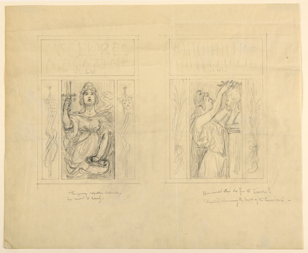 Inscribed in graphite, lower left: The young republic dedicating/ her sword to liberty; in graphite, lower right: How would [...] do for [...] Lincoln?/ Columbia crowning the bust of the Emanicipation