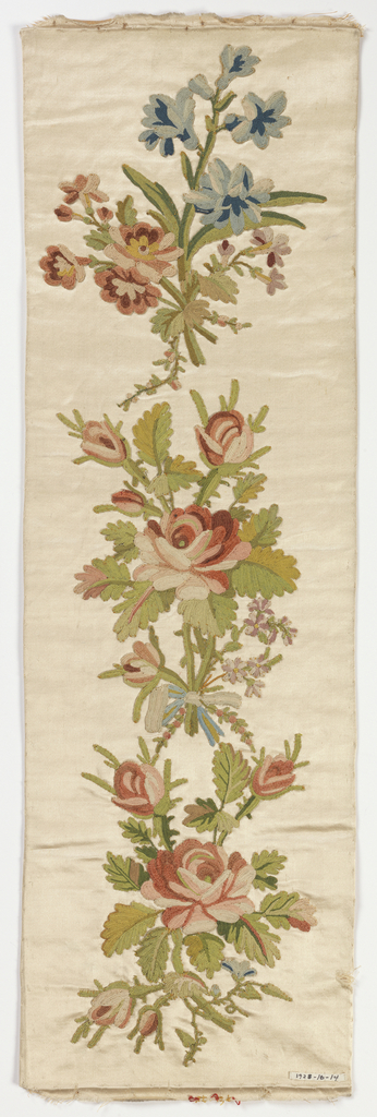 This is a panel. It is dated ca. 1770 and we acquired it in 1928. Its medium is silk embroidery on silk foundation and its technique is embroidered on satin weave. It is a part of the Textiles department.