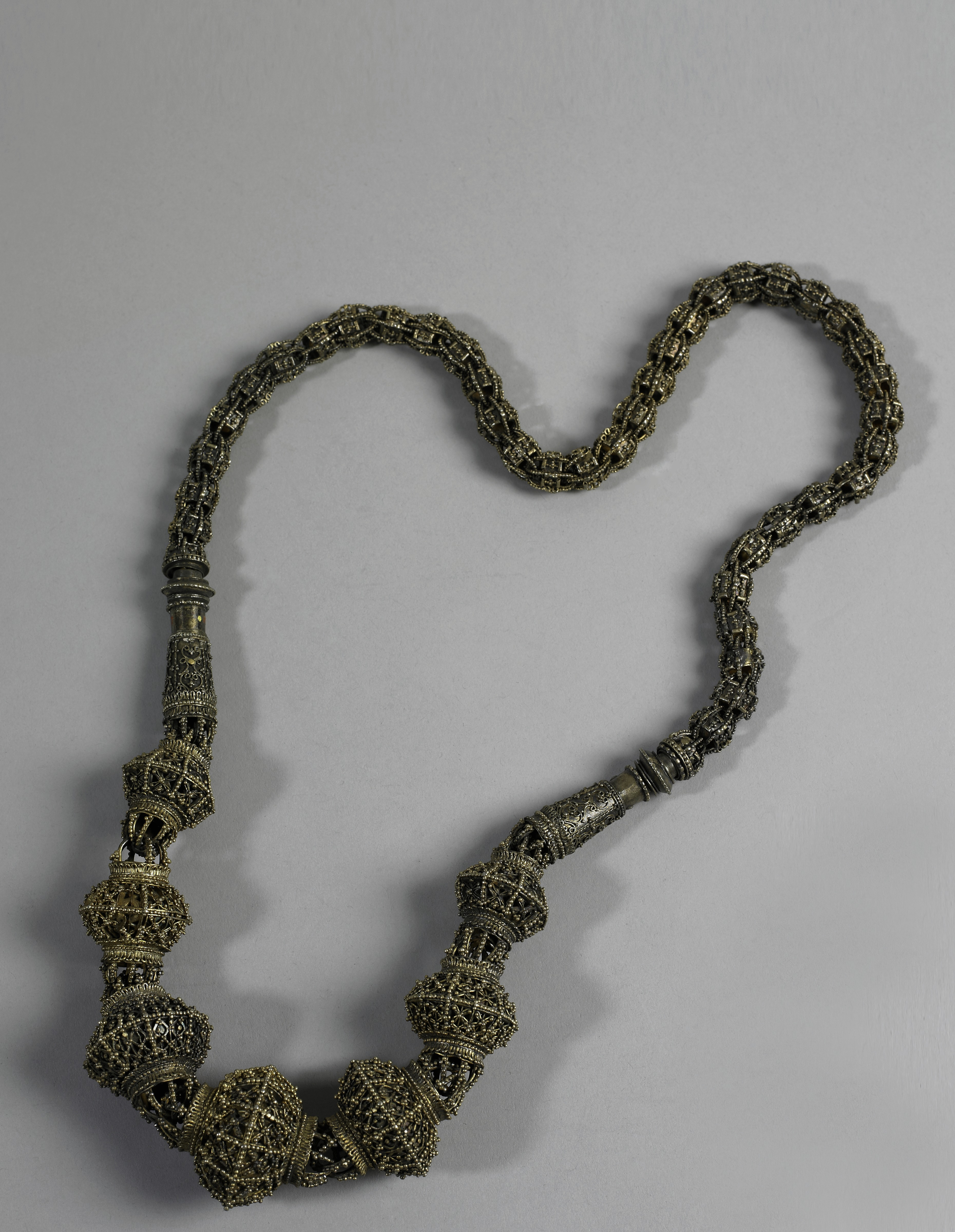This is a necklace. It is dated 19th century and we acquired it in 1931. Its medium is gilt silver. It is a part of the Product Design and Decorative Arts department.