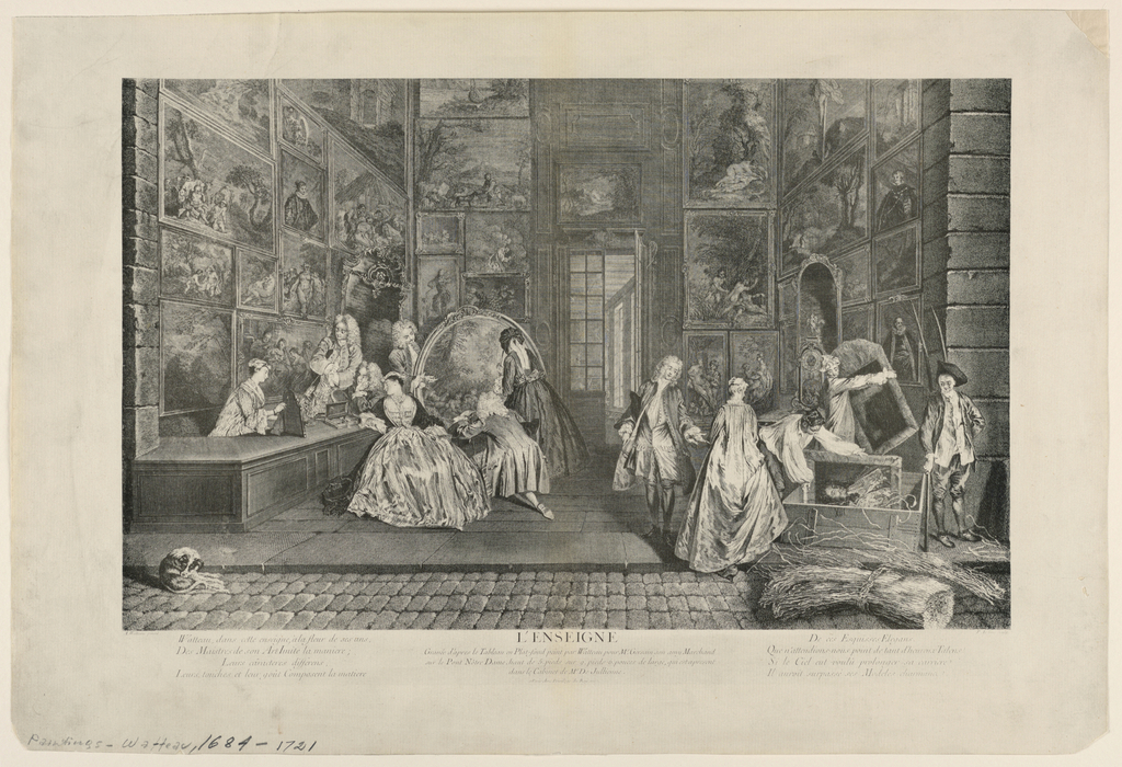 Inscribed in plate, lower left: A. Watteau pinxit; lower center: L'Enseigne; lower right: P. Aveline Sculp. [and an eight-line eulogy to Watteau]
