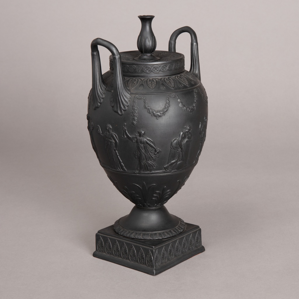 This is a urn. It was decorated by John Flaxman and manufactured by Wedgwood. It is dated 1780–1800 and we acquired it in 1938. Its medium is stoneware ("black basalt"). It is a part of the Product Design and Decorative Arts department.