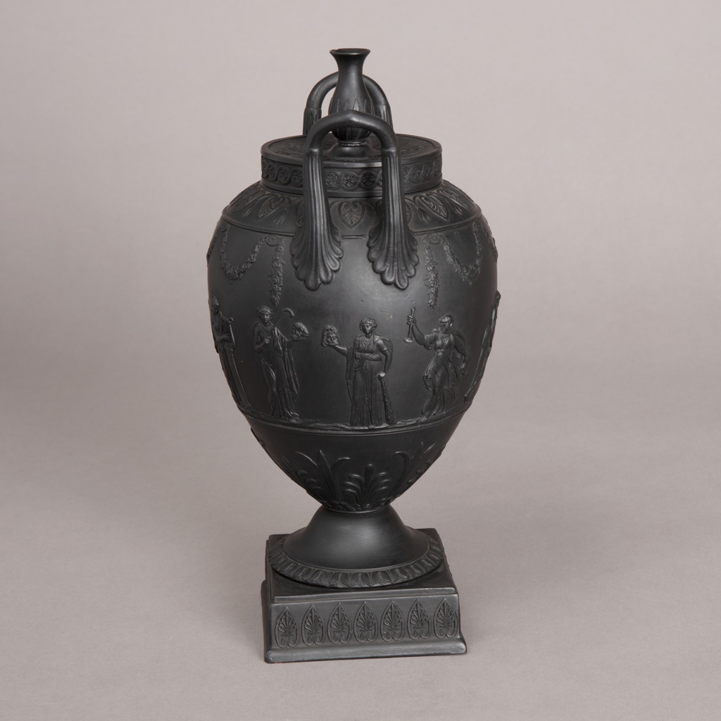 This is a urn. It was decorated by John Flaxman and manufactured by Wedgwood. It is dated 1780–1800 and we acquired it in 1938. Its medium is stoneware ("black basalt"). It is a part of the Product Design and Decorative Arts department.