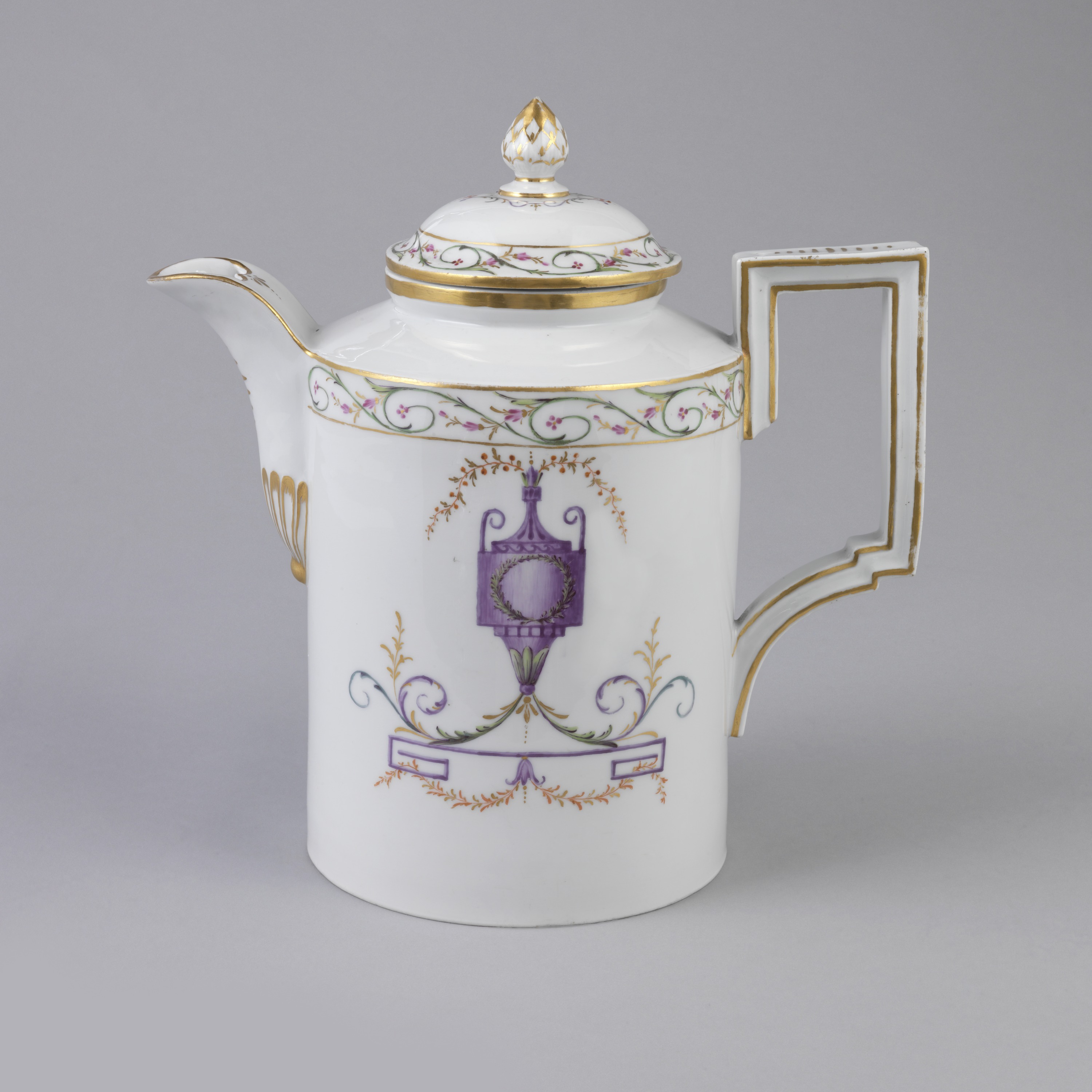 Coffeepot with Urn Pattern Coffeepot; Manufactured by Fürstenberg Porcelain Manufactory (Germany); Germany; hard paste porcelain, vitreous enamel, gold; H x W (a,b: overall): 21 x 21.1 cm (8 1/4 x 8 5/16 in.) H x W x D (a: teapot): 17 x 12.2 x 21.1 cm (6 11/16 x 4 13/16 x 8 5/16 in.) H x diam. (b: lid): 6.2 x 7.8 cm (2 7/16 x 3 1/16 in.); Bequest of Erskine Hewitt; 1938-57-675-a,b
