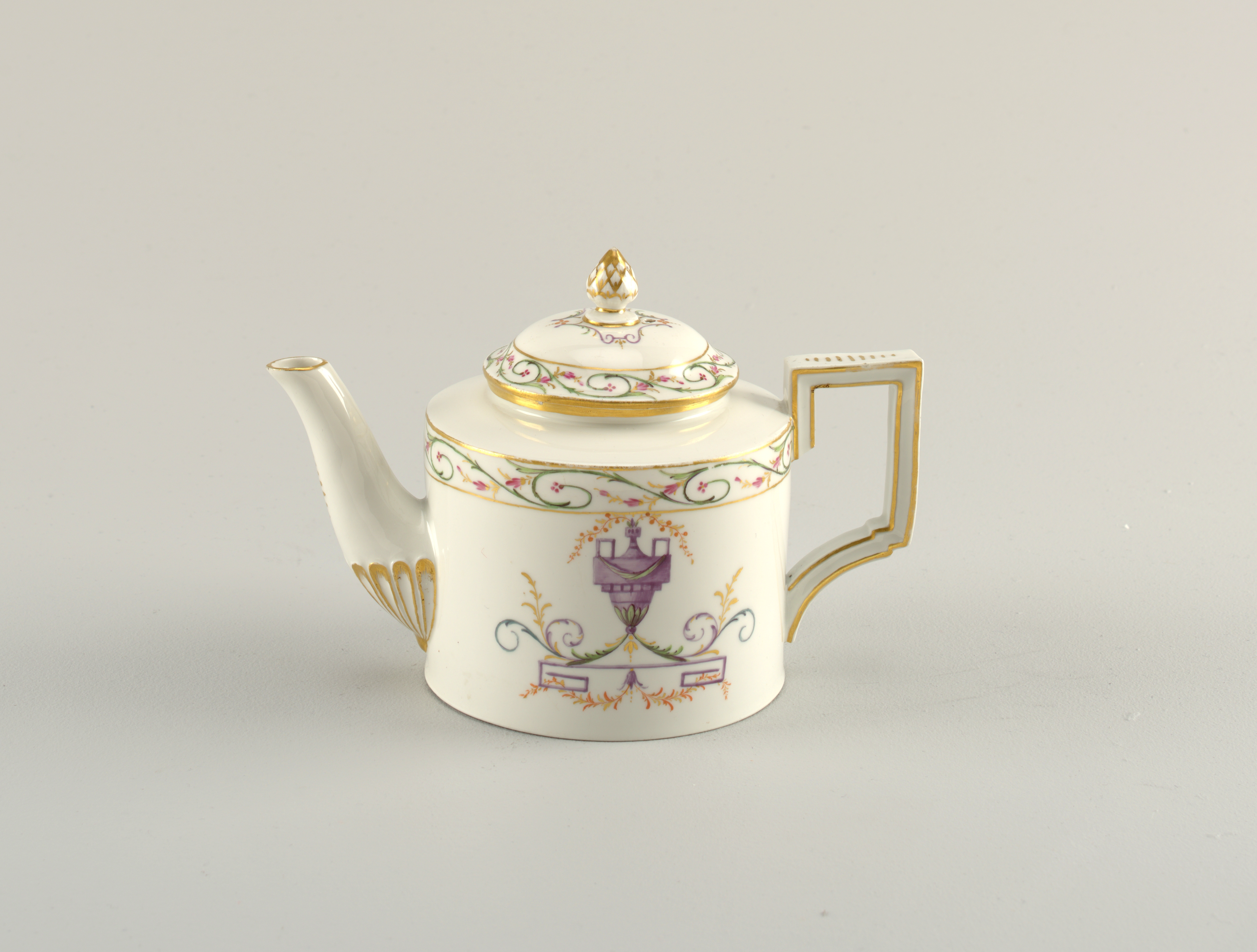 Teapot with Urn Pattern Teapot; Manufactured by Fürstenberg Porcelain Manufactory (Germany); Germany; hard paste porcelain, vitreous enamel, gold; H x W x D (a,b: overall): 13 × 19.7 × 11 cm (5 1/8 × 7 3/4 × 4 5/16 in.) H x W x D (a: pot): 9.7 × 19.7 × 11 cm (3 13/16 × 7 3/4 × 4 5/16 in.) H x diam. (b: lid): 5.5 × 7.7 cm (2 3/16 × 3 1/16 in.); Bequest of Erskine Hewitt; 1938-57-676-a,b