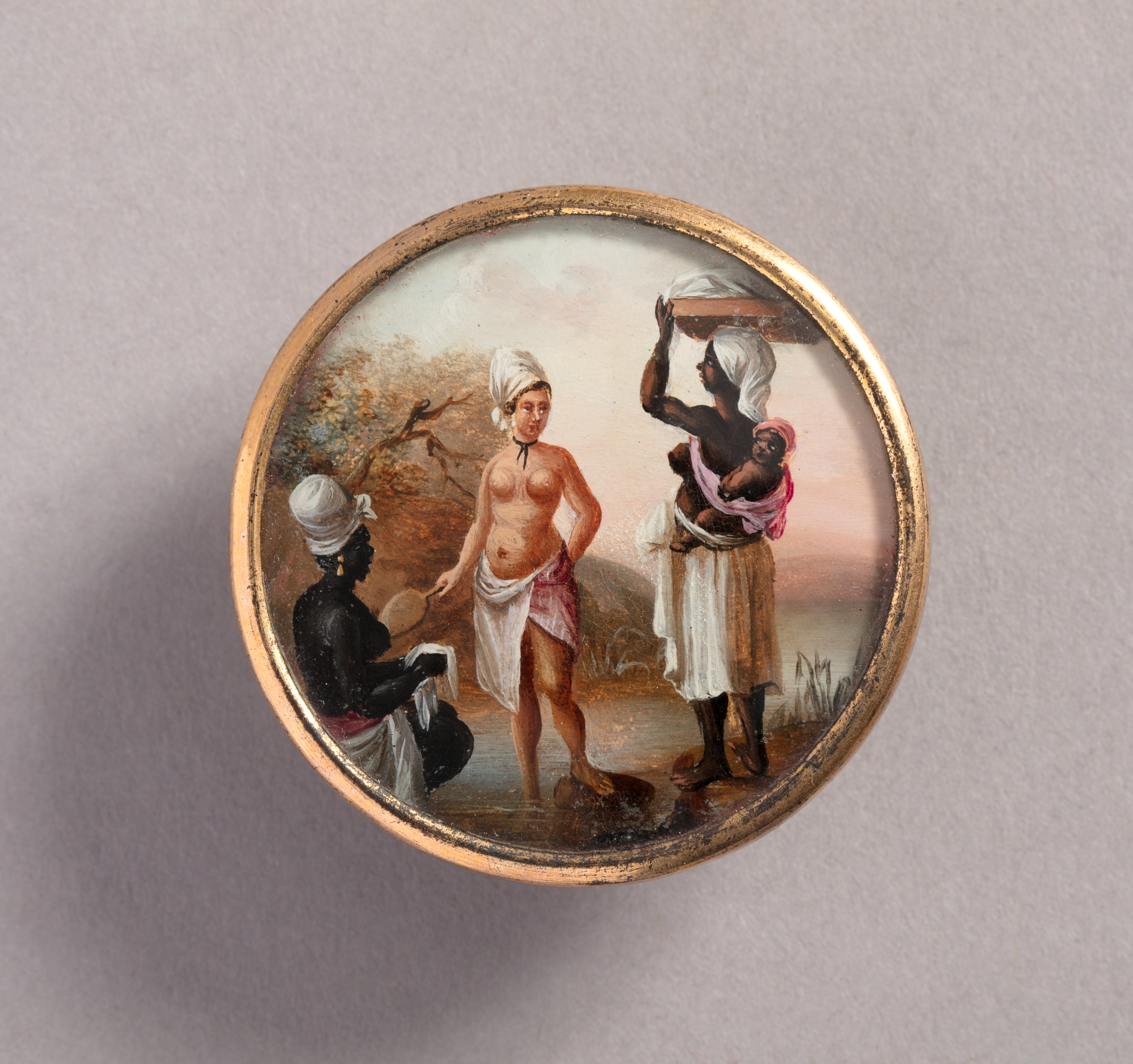 Button (Haiti); Attributed to Agostino Brunias (Italian, ca. 1730–1796); Made for Toussaint L'Ouverture; gouache paint on tin verre fixé, ivory (backing), glass, gilt metal; H x diam.: 1 x 3.7 cm (3/8 x 1 7/16 in.); Gift of R. Keith Kane from the Estate of Mrs. Robert B. Noyes; 1949-94-17