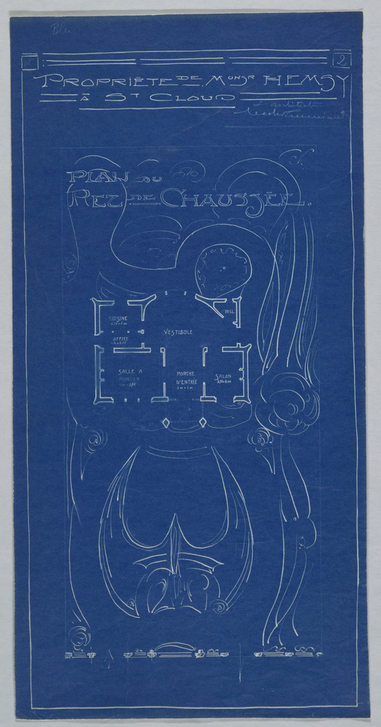 Blueprint, Villa od M. Hemsy, St. Cloud, Plan du Rez de Chaussee; Architect: Hector Guimard ((French, 1867–1942)); blueprint; 54.6 x 27.6 cm (21 1/2 x 10 7/8 in.), irregular; Gift of Mme. Hector Guimard; 1950-66-19