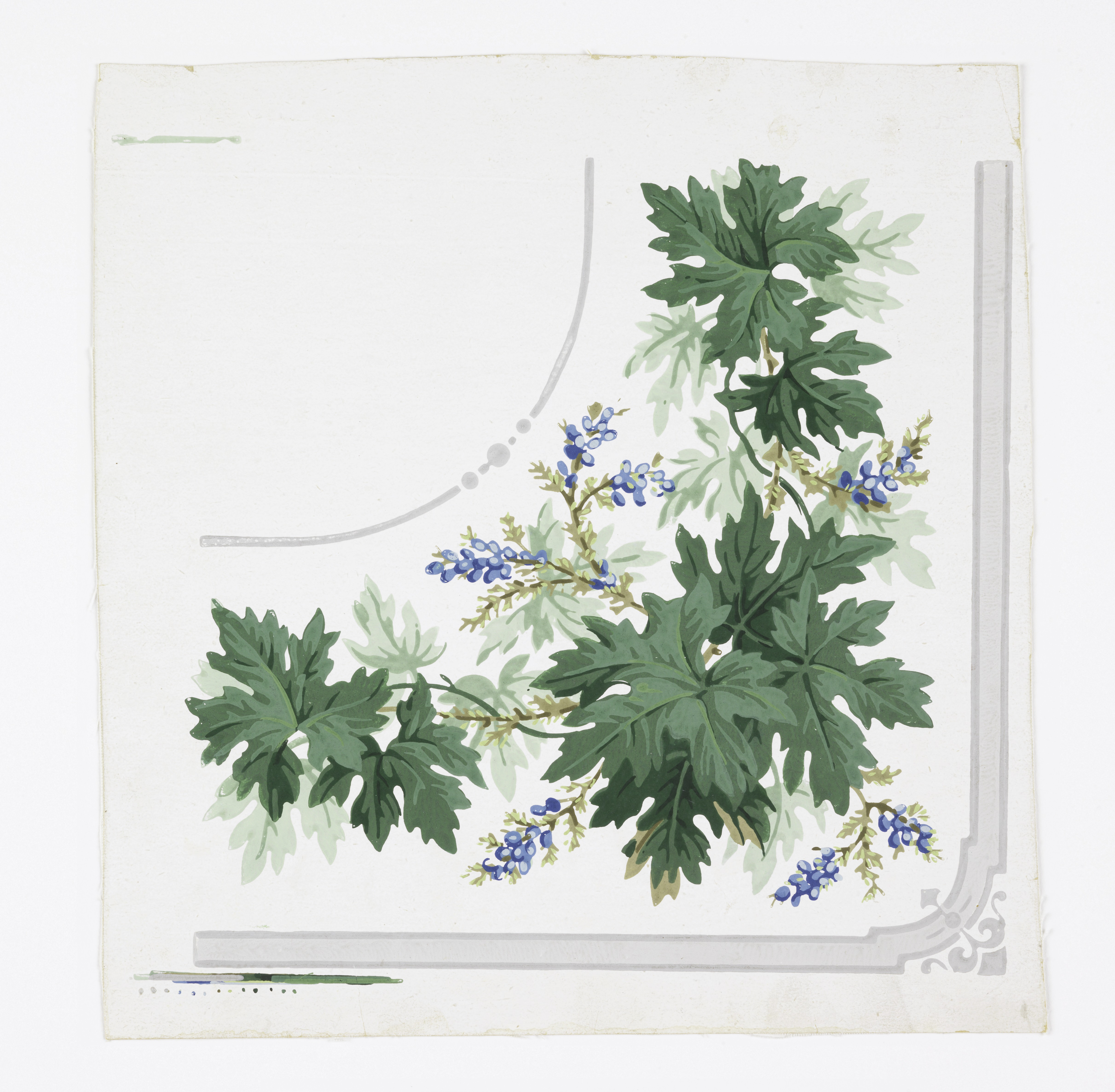 This is a Border corner. It is dated 1840–45 and we acquired it in 1951. Its medium is block-printed. It is a part of the Wallcoverings department.