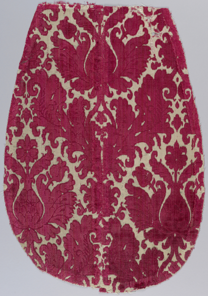 This is a Fragment. It is dated 17th century and we acquired it in 1953. Its medium is silk, metallic thread and its technique is velvet. It is a part of the Textiles department.