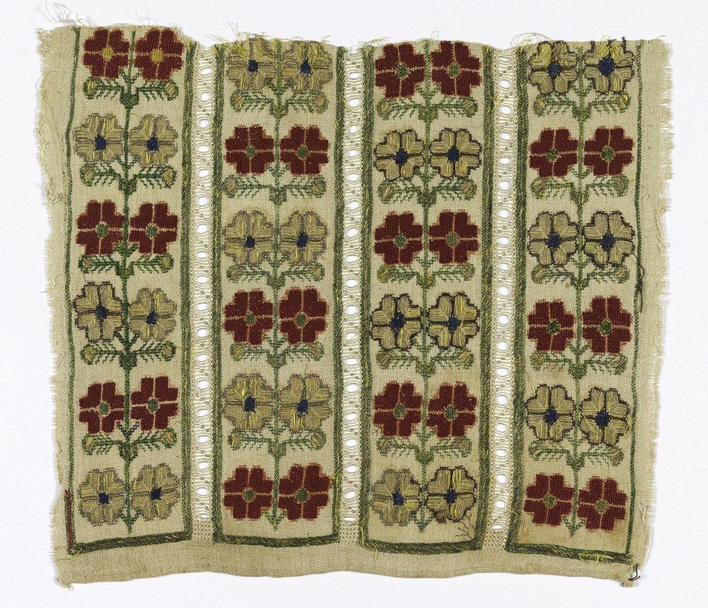 This is a Textile. It is dated 19th century and we acquired it in 1955. Its medium is silk and metal embroidery on linen foundation and its technique is embroidered in cross stitch on plain weave. It is a part of the Textiles department.