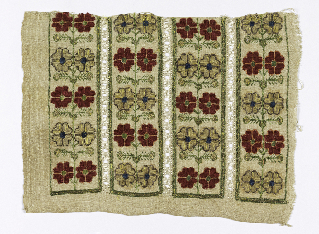 This is a Textile. It is dated 19th century and we acquired it in 1955. Its medium is silk and metal embroidery on linen foundation and its technique is embroidered in cross stitch on plain weave. It is a part of the Textiles department.
