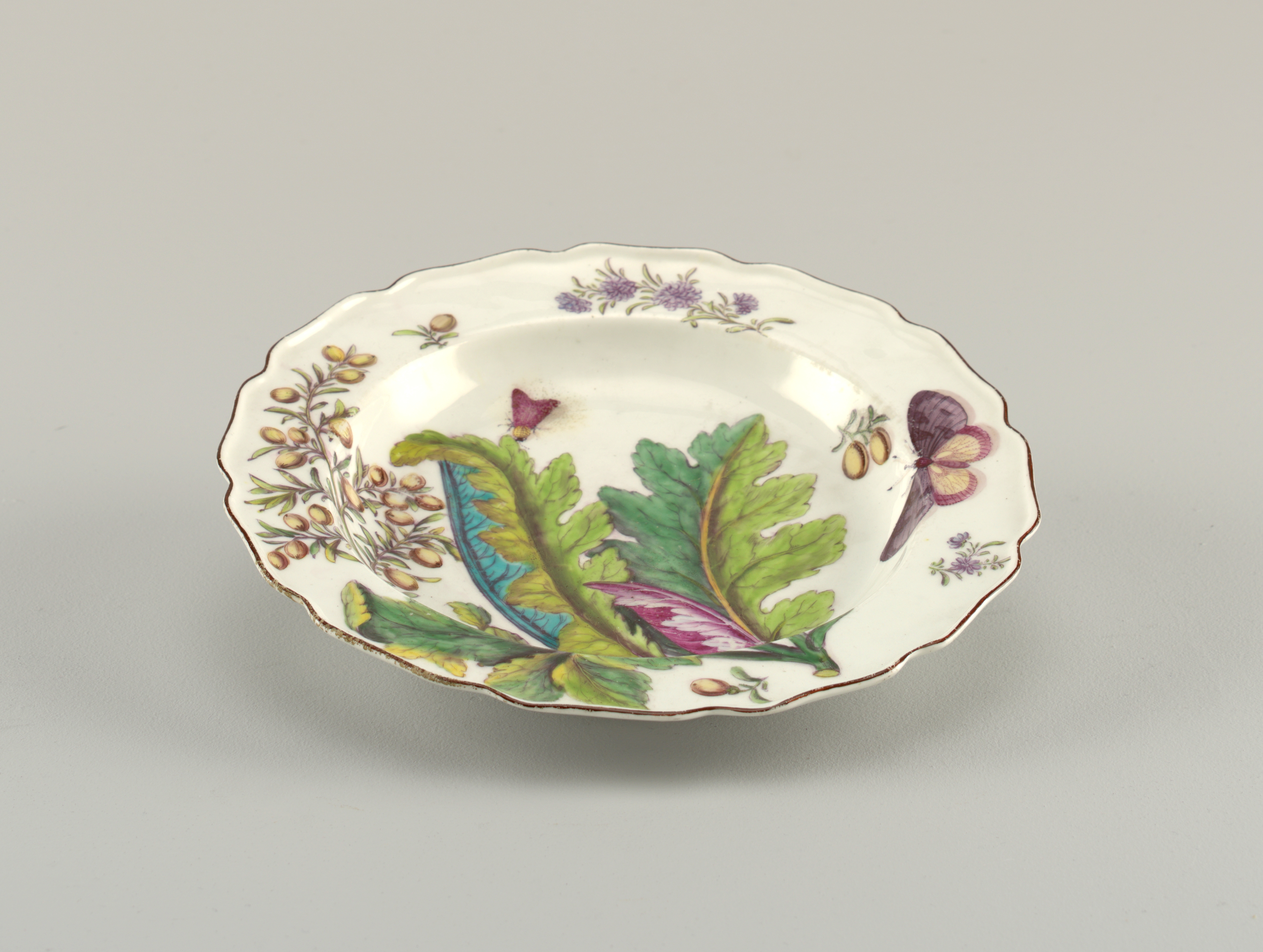 This is a plate. It was manufactured by Chelsea Porcelain Manufactory and after Georg Dionysius Ehret. It is dated 1754–1758 and we acquired it in 1957. Its medium is soft paste porcelain, vitreous enamel. It is a part of the Product Design and Decorative Arts department.