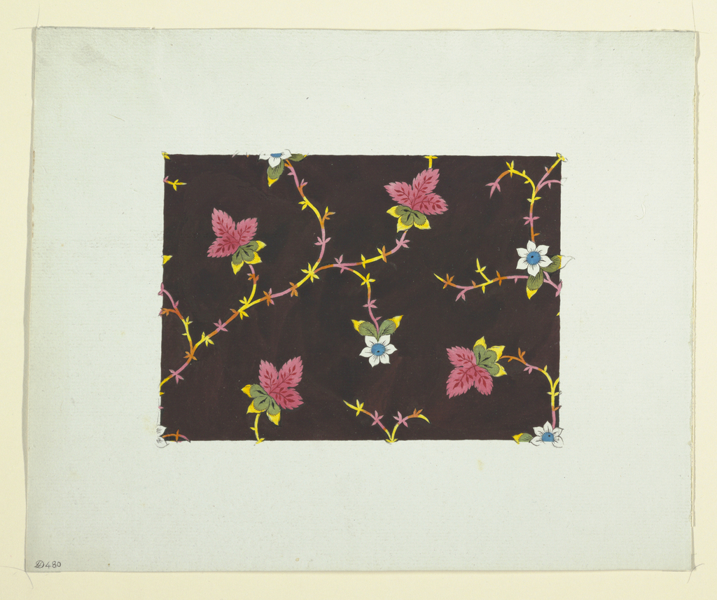 Drawing, Floral design for printed textiles; Designed by Louis-Albert DuBois (Swiss, 1752–1818); France; brush and gouache, graphite on blue wove paper; Sheet: 22.8 x 28 cm (9 x 11 in.) Image: 12 x 17 cm (4 3/4 x 6 11/16 in.); Museum purchase from Friends of the Museum Fund; 1957-46-1