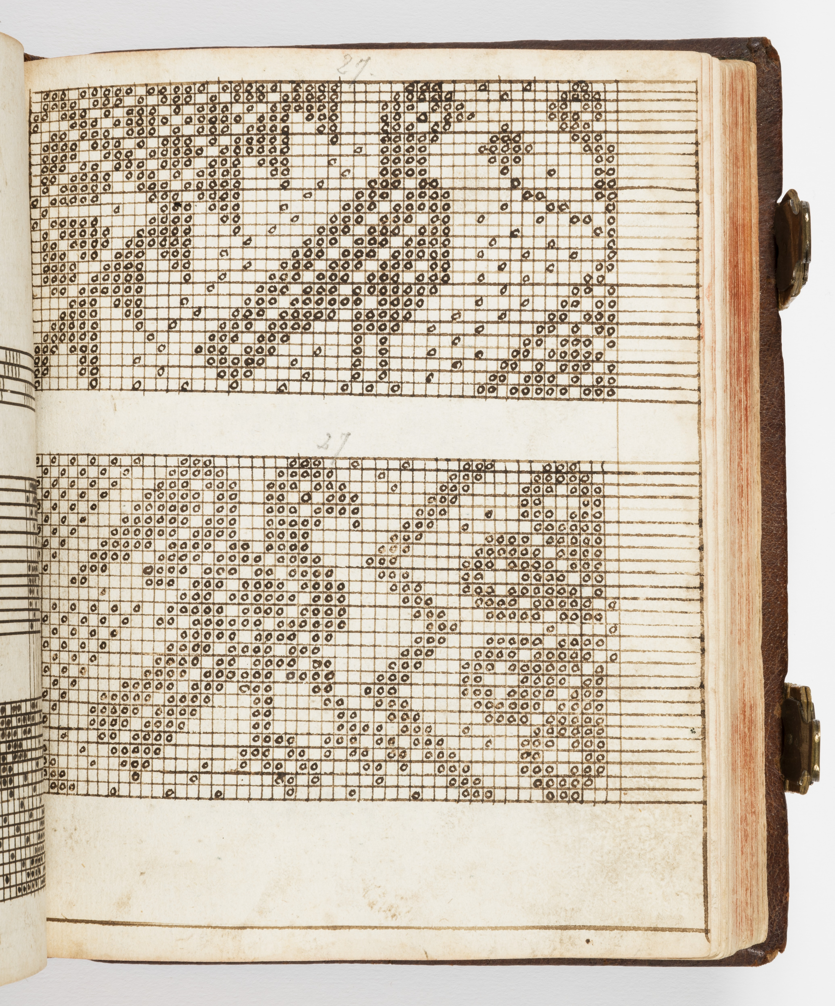 This is a Pattern book. It is dated 1760 and we acquired it in 1961. Its medium is leather, paper, metal. It is a part of the Textiles department.
