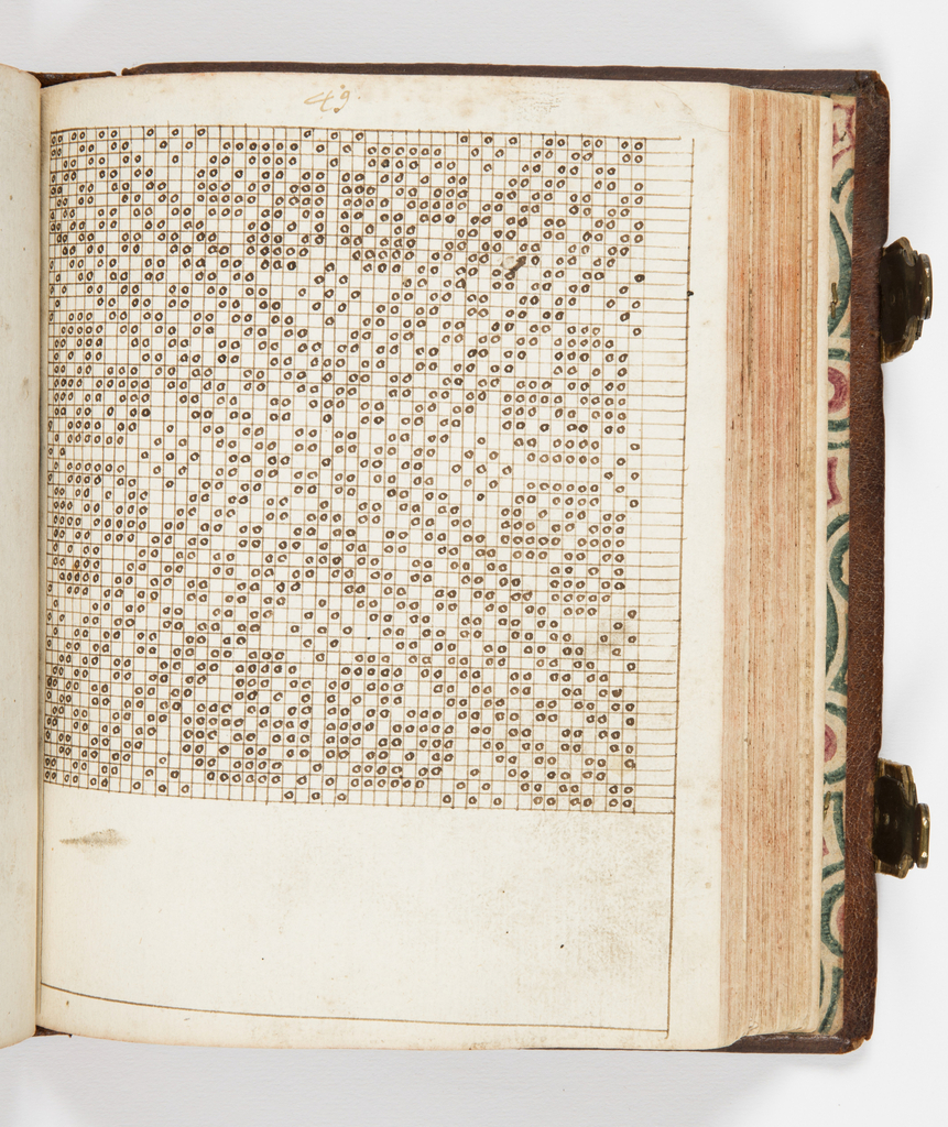 This is a Pattern book. It is dated 1760 and we acquired it in 1961. Its medium is leather, paper, metal. It is a part of the Textiles department.