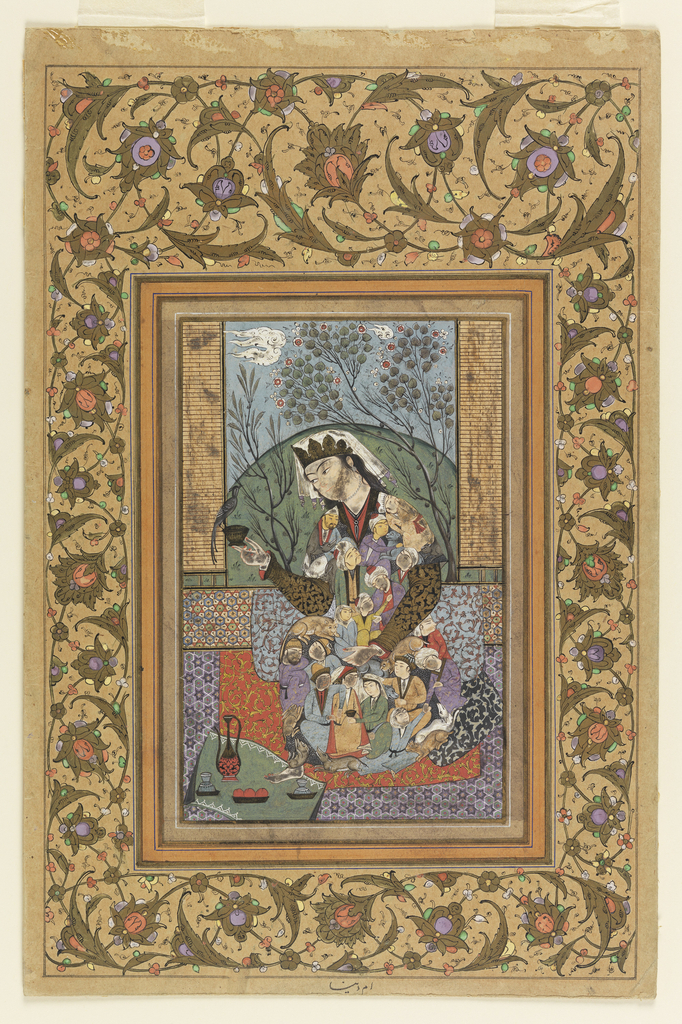 In this drawing, the interweaving of forms helps create pictorial density, particularly in the carpet and floor. This drawing likely references an older work, shedding light on the copying and reproduction tradition within miniature painting.