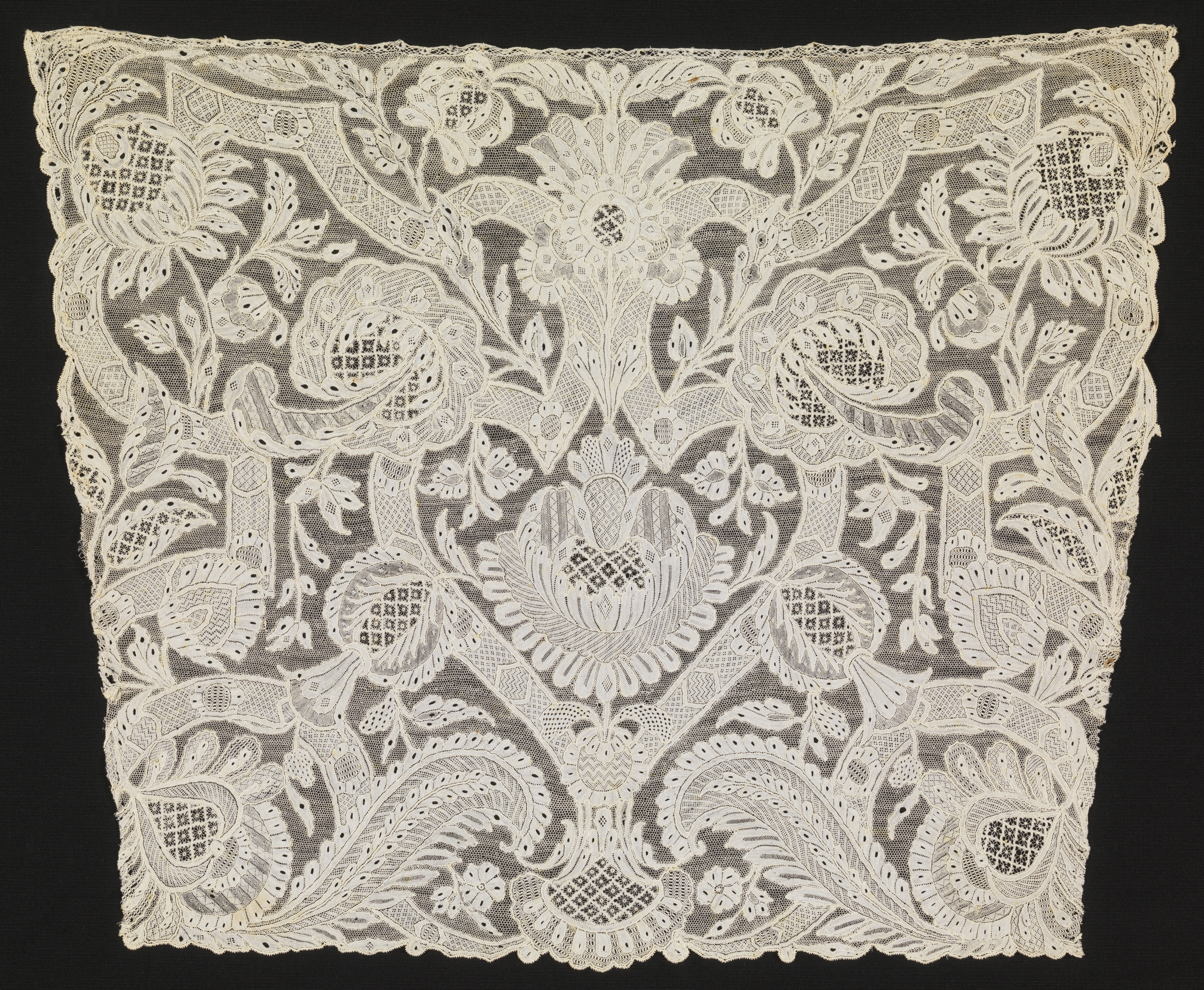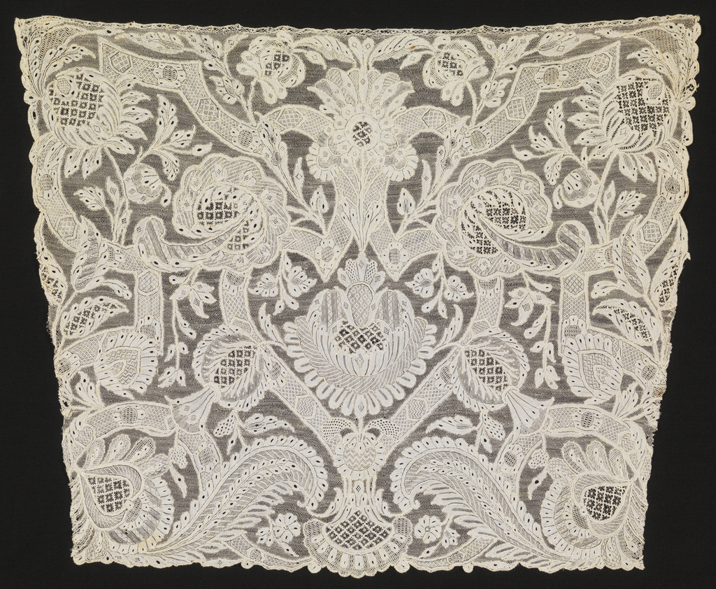 This is a Cravat end. It is dated 1700–1750 and we acquired it in 1962. Its medium is linen and its technique is needle lace with ground of loop and twist with twist return. It is a part of the Textiles department.