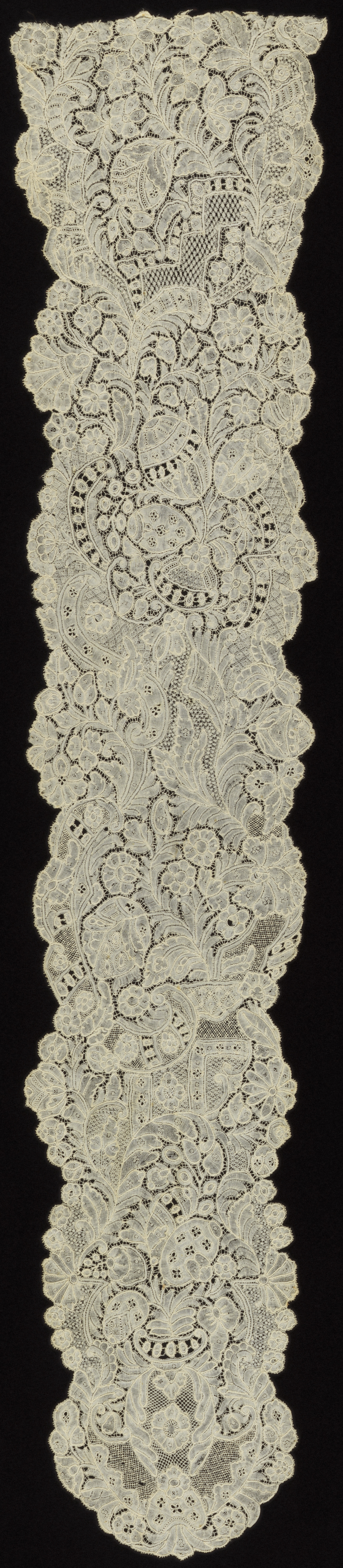This is a Cap streamers. It is dated 1700–1750 and we acquired it in 1962. Its medium is linen and its technique is bobbin lace, brussels style. It is a part of the Textiles department.