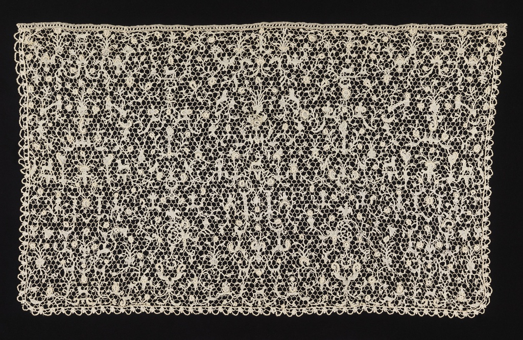 This is a Cravat end. It is dated 1690–99 and we acquired it in 1962. Its medium is linen and its technique is needle lace, 6 sided reworked grounds. It is a part of the Textiles department.