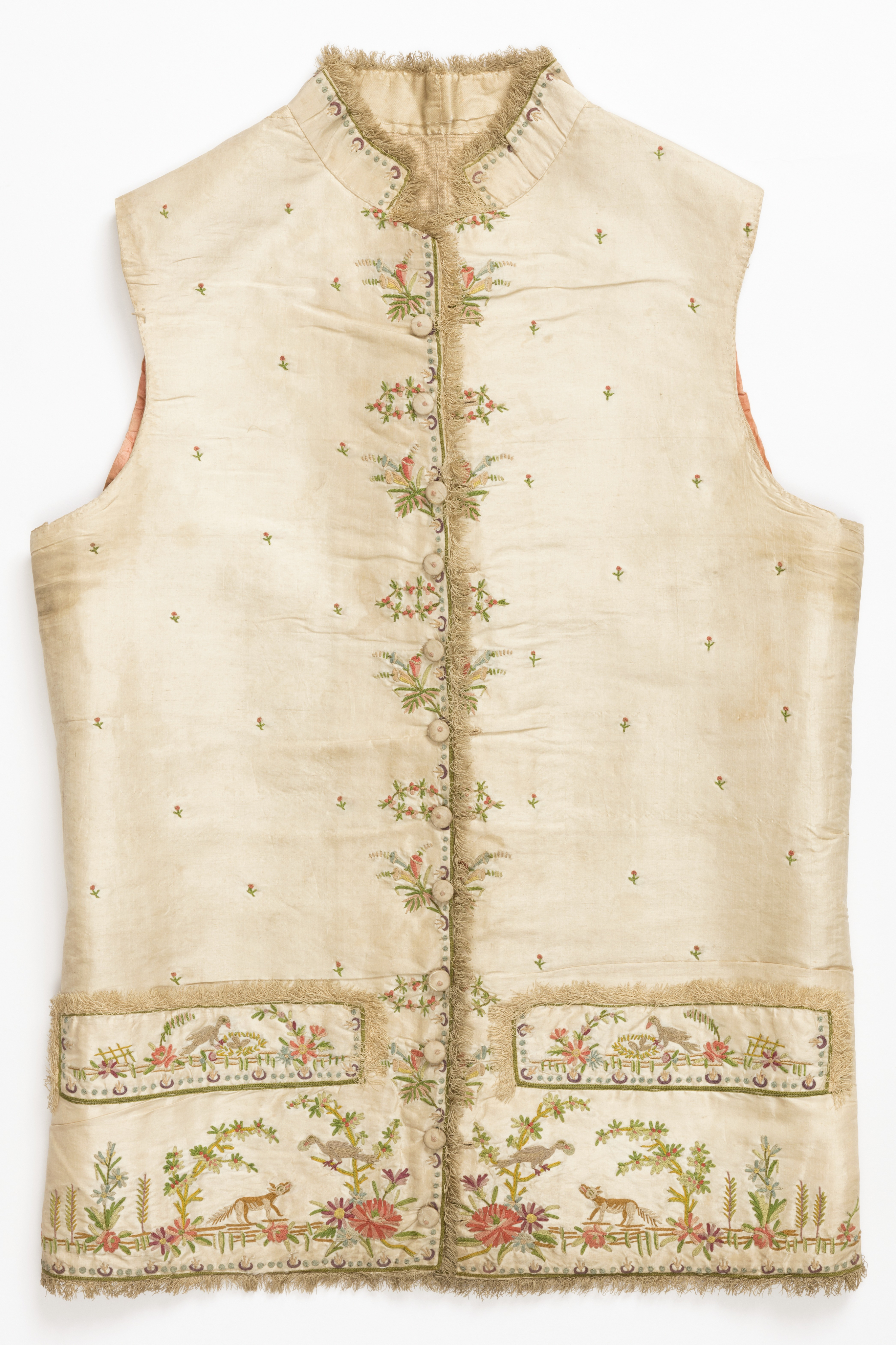 This is a Waistcoat. It is dated late 18th century and we acquired it in 1962. Its medium is silk and its technique is chain-stitch embroidery. It is a part of the Textiles department.