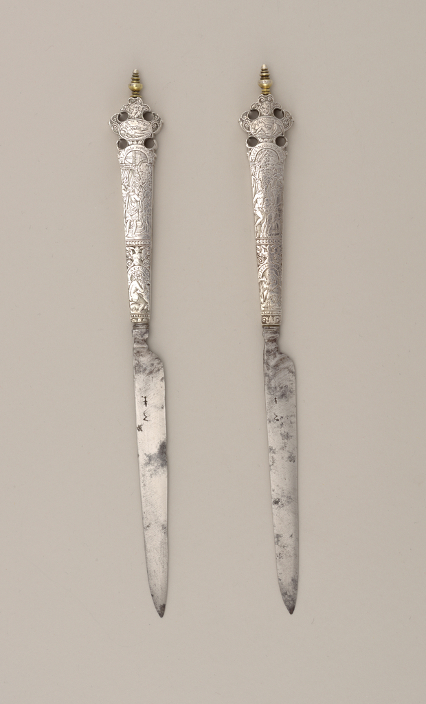 This is a knife. It is dated ca. 1618 and we acquired it in 1962. Its medium is silver, steel, gold plating. It is a part of the Product Design and Decorative Arts department.