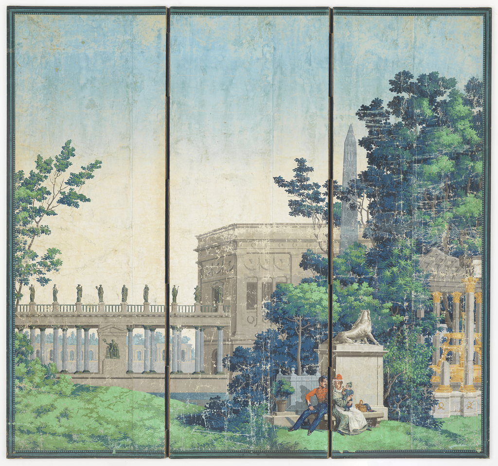 This is a screen. It was designed by Pierre-Antoine Mongin and manufactured by Zuber & Cie. It is dated 1821 and we acquired it in 1971. Its medium is block printed on paper. It is a part of the Wallcoverings department.
