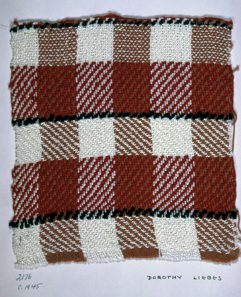 This is a Sample card. It was designed by Dorothy Wright Liebes and woven by Dorothy Wright Liebes. It is dated ca. 1945 and we acquired it in 1972. Its medium is cotton, viscose rayon, silk and its technique is 2/2 twill woven; white warps operate singly and red warps are alternately paired and single. It is a part of the Textiles department.