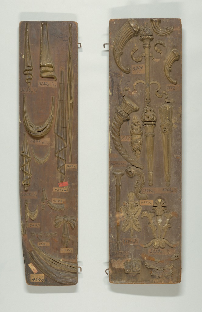 Called “imitation wood carvings”, composition ornaments were formed of a press-molded material typically composed of chalk, glue, linseed oil and resin. Since the latter part of the 18th century, architectural composition ornaments have been a less expensive alternative to ornamental plaster and carved wood for moldings, mantelpieces, paneling and frames. These samples give an indication of the proliferation of ornamental styles in the late 19th century available to craftsmen and architects.