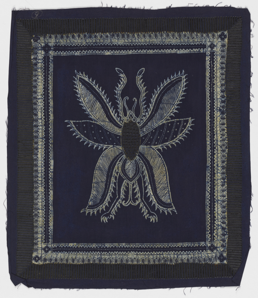This is a Batik process samples. It is dated mid- 20th century and we acquired it in 1974. Its medium is cotton and its technique is wax-resist dyed (batik) on plain weave. It is a part of the Textiles department.