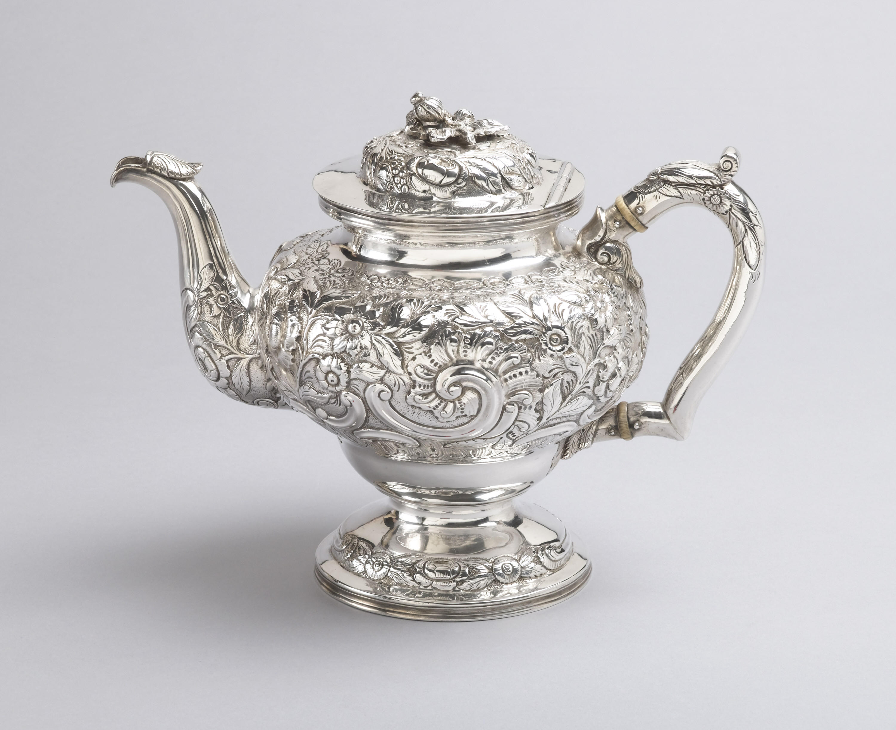 Teapot Teapot; Manufactured by Samuel Kirk & Son; Made by Samuel Kirk (American, 1793–1872); USA; silver, ivory; H x W x D: 21.5 × 28 × 16.3 cm (8 7/16 in. × 11 in. × 6 7/16 in.); Gift of Allyn Cox; 1976-109-1-a