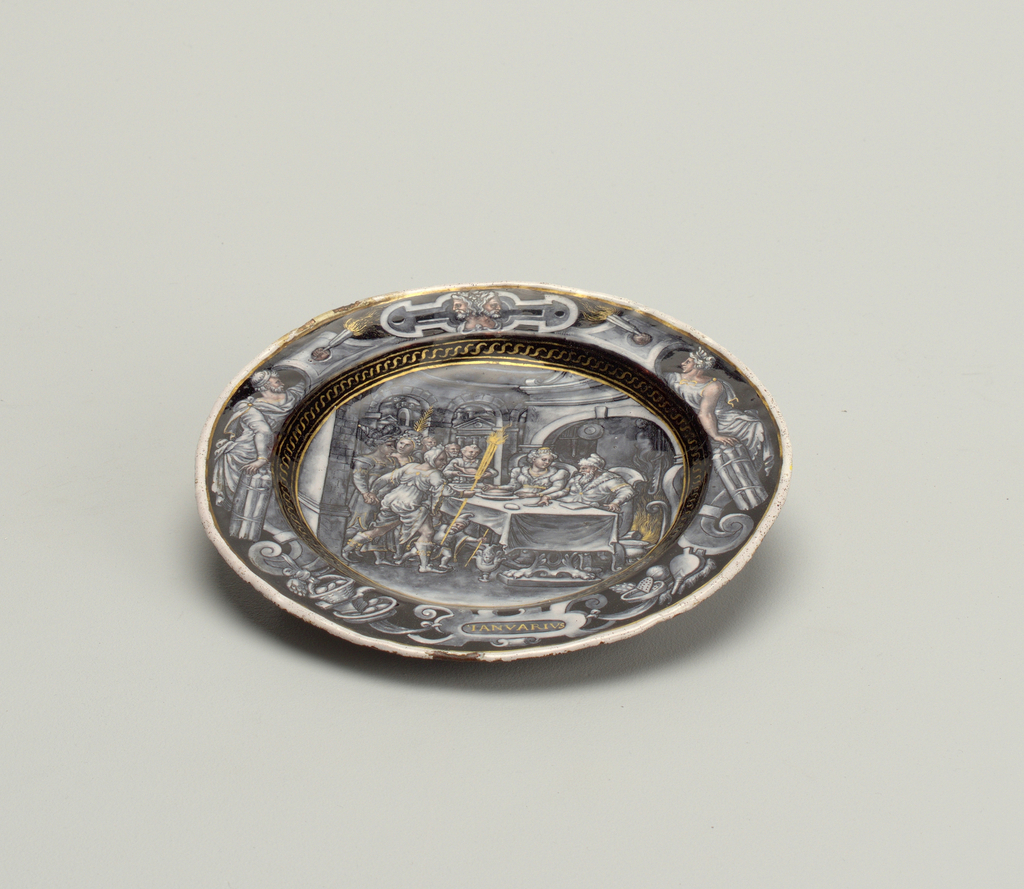 Ianvarivs (January) Plate; Designed by Martial Courteys; France; grisaille enamel, flesh tones, touches of color, and gold on molded copper; H x diam.: 1.8 x 18.4 cm (11/16 x 7 1/4 in.); Gift of Mrs. Howard J. Sachs and Mr. Peter G. Sachs in memory of Miss Edith L. Sachs; 1978-168-65