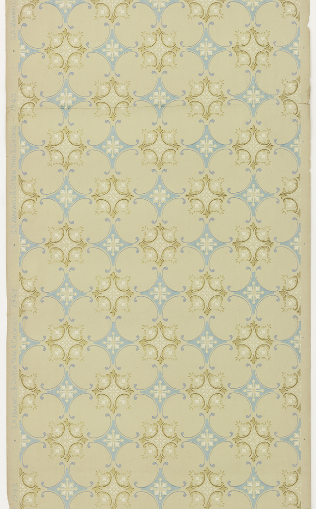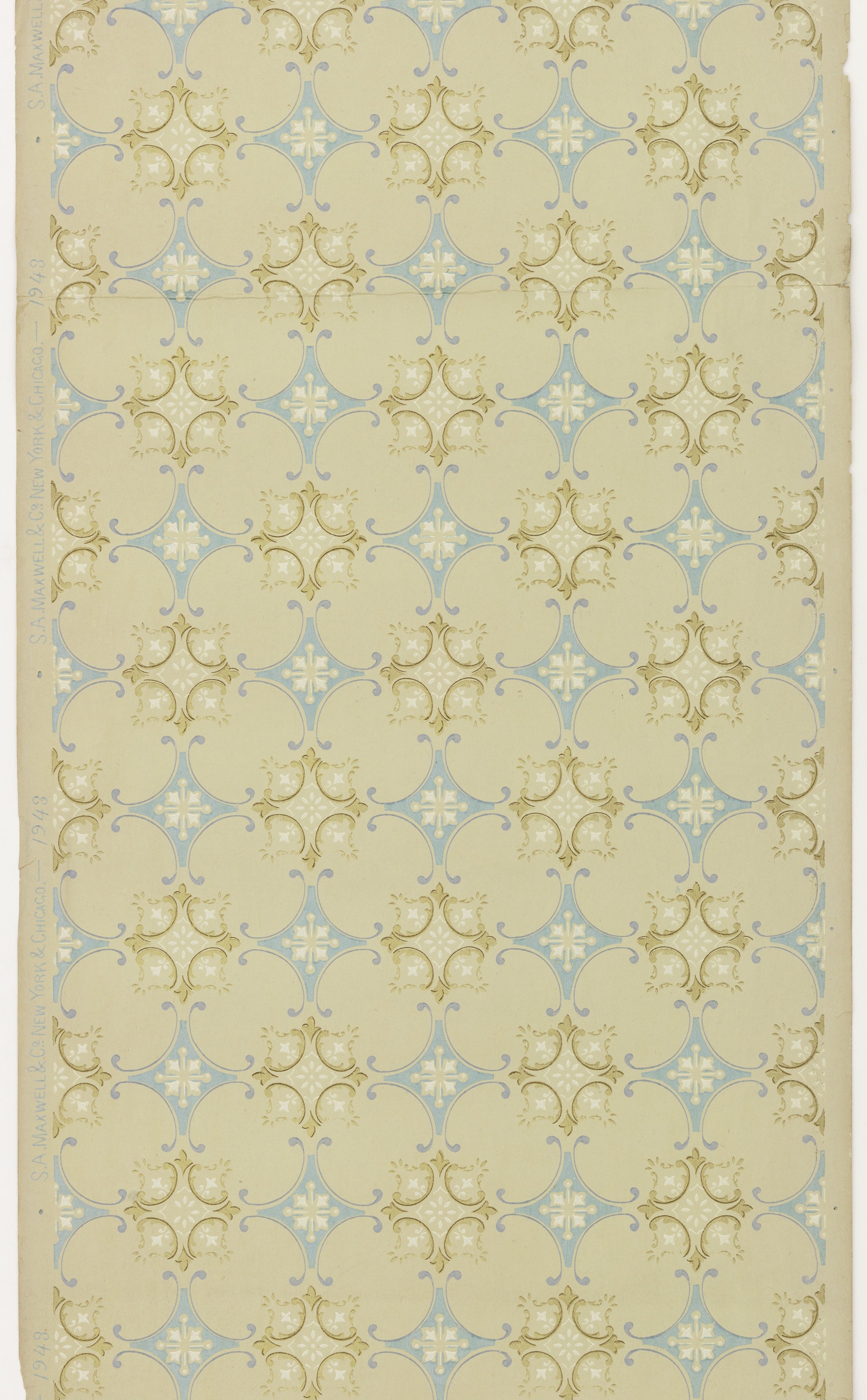 This is a Ceiling paper. It was manufactured by Maxwell & Co., S.A.. It is dated 1905–1915 and we acquired it in 1979. Its medium is machine-printed paper, liquid mica. It is a part of the Wallcoverings department.