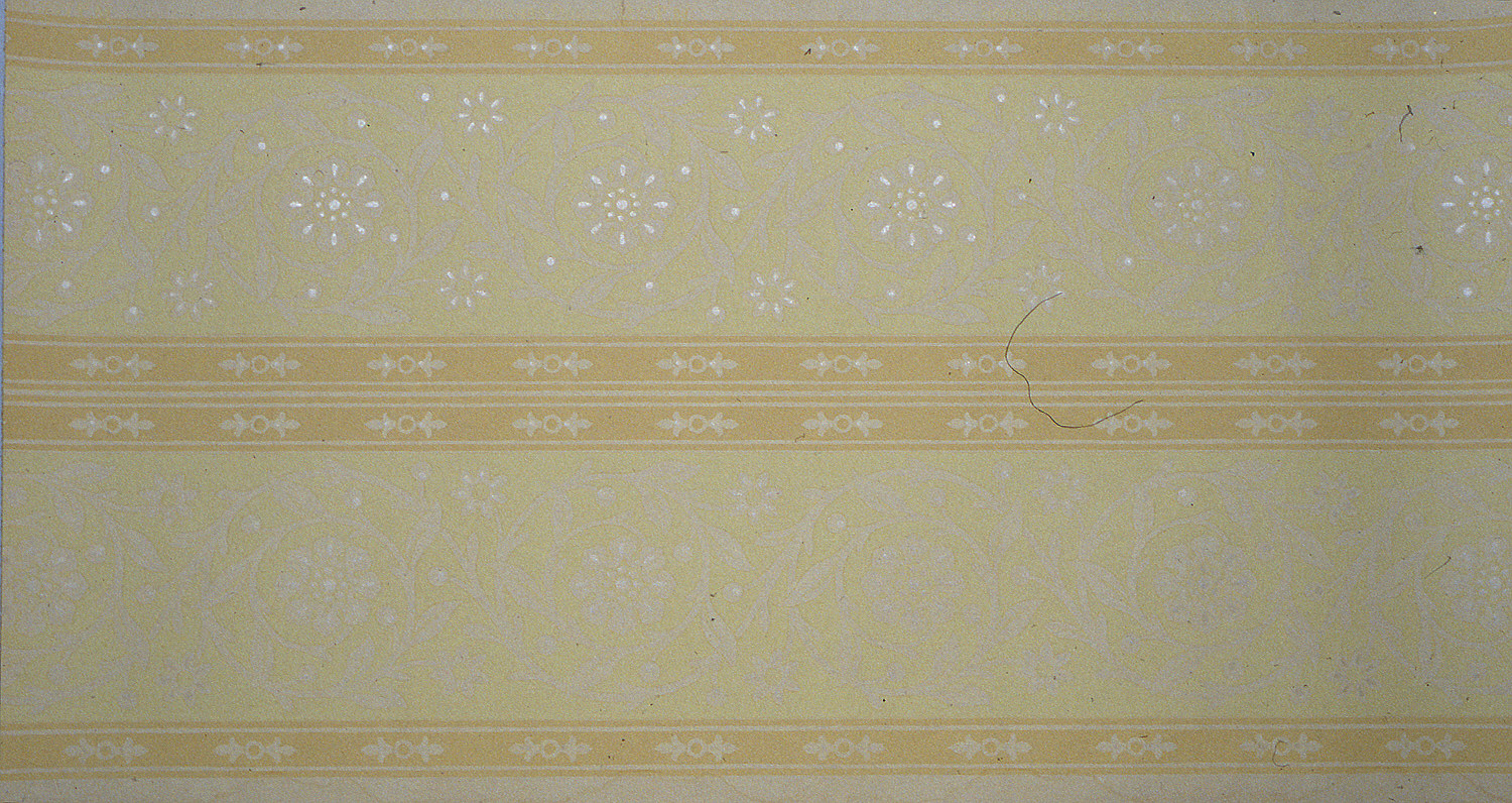 This is a frieze. It was manufactured by Howell and Brothers. It is dated 1905–1915 and we acquired it in 1979. Its medium is machine-printed paper, liquid mica. It is a part of the Wallcoverings department.
