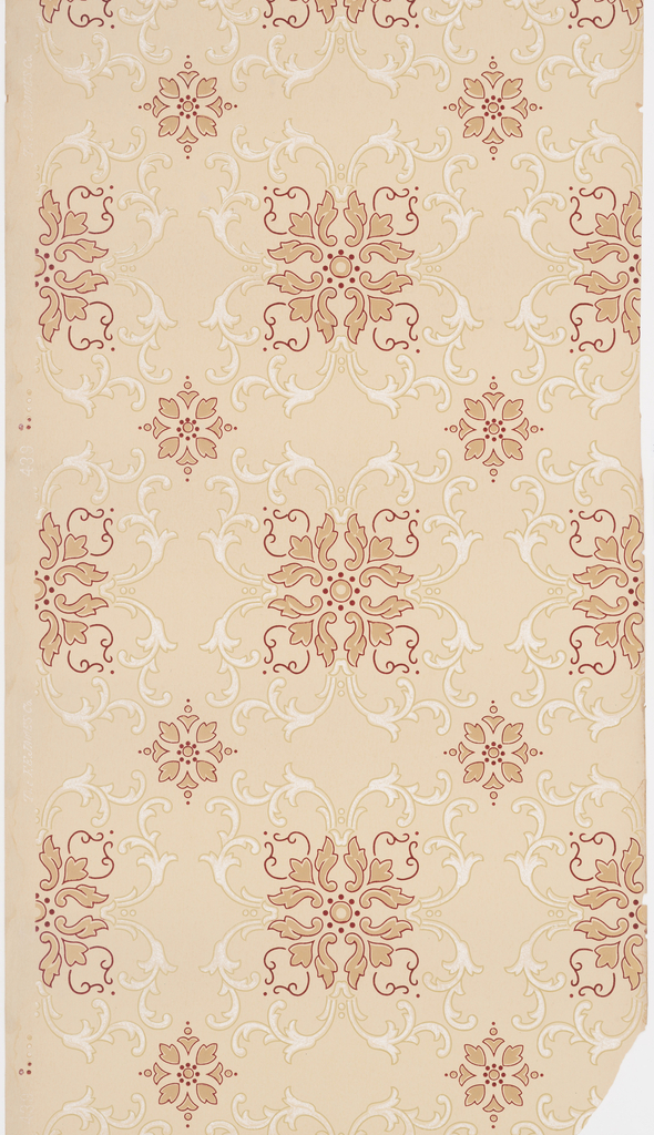 This is a Ceiling paper. It was manufactured by F. E. James Co.. It is dated 1905–1915 and we acquired it in 1979. Its medium is machine-printed paper, liquid mica. It is a part of the Wallcoverings department.