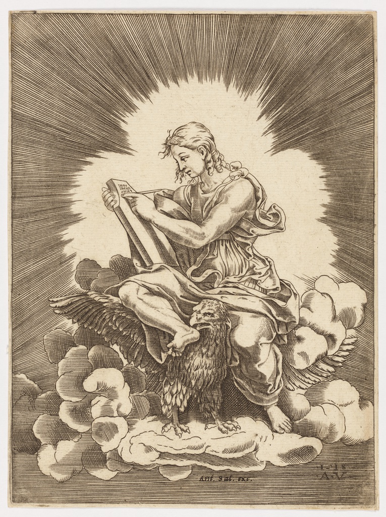 Print, Saint John, writing, seated on an Eagle; After Giulio Romano (Italian, 1499–1546), Agostino Veneziano (Italian, ca. 1490 - after 1536); Published by Antonio Salamanca (Italian, ca. 1500 - 1562); engraving on paper; 26 × 19.5 cm (10 1/4 × 7 11/16 in.); Museum purchase through gift of various donors and from Eleanor G. Hewitt Fund; 1938-88-8671