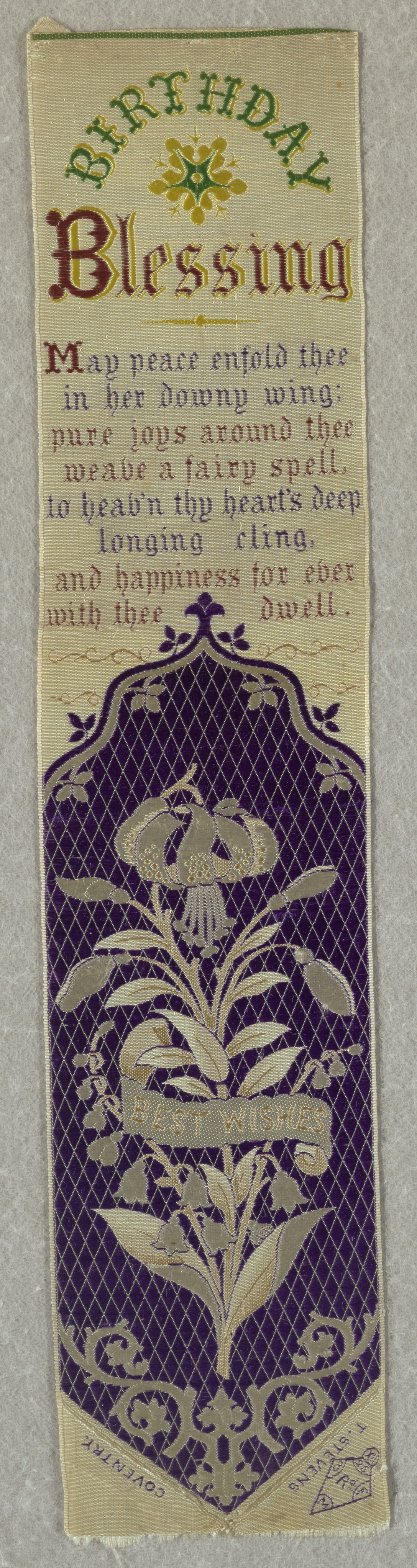 Bookmark, Birthday Blessing; Manufactured by Thomas Stevens (English, 1828–1888); England; silk; H x W: 25.3 × 5.6 cm (9 15/16 × 2 3/16 in.); 1941-11-1