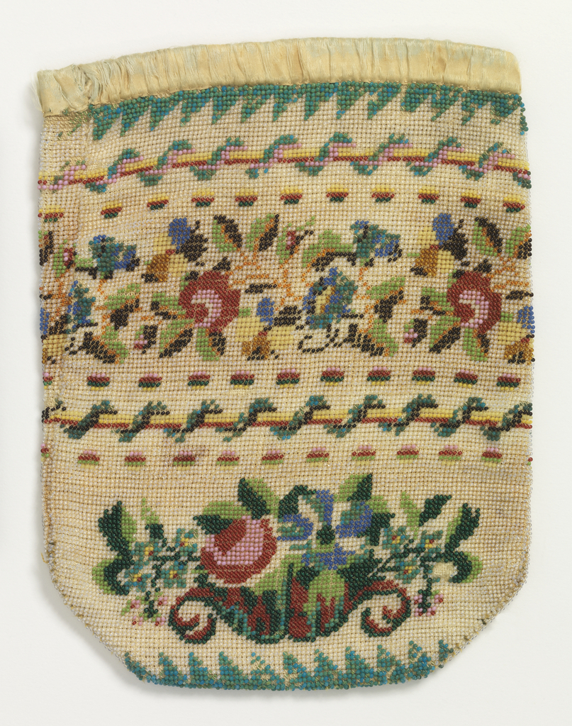 This is a Bag. It is dated early 19th century and we acquired it in 1944. Its medium is cotton, glass and ceramic beads and its technique is embroidered beadwork. It is a part of the Textiles department.