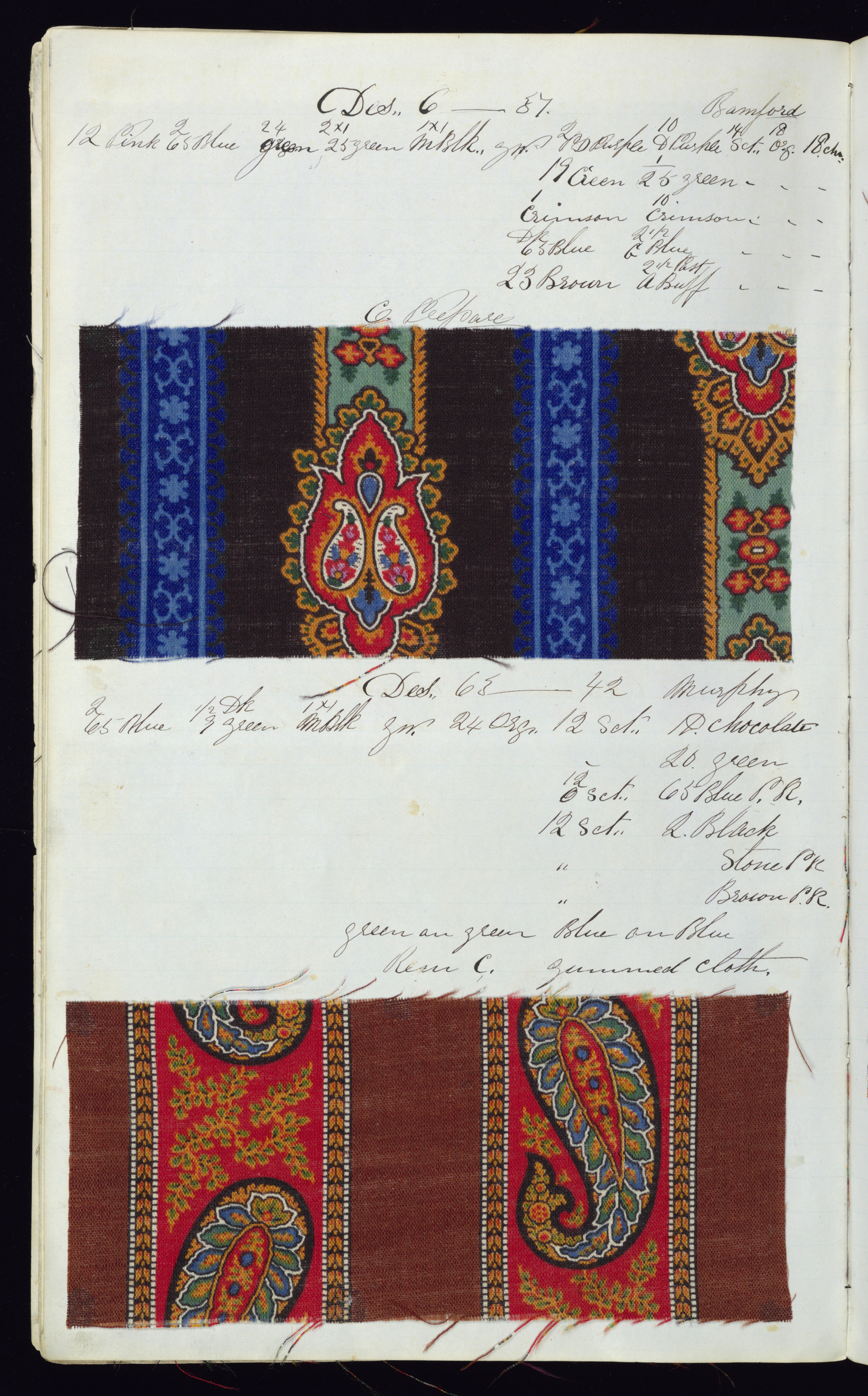 This object was donated by Frederick J. Whitehead. It is credited Gift of Frederick J. Whitehead from the collection compiled by his father Cornelius Whitehead at the Pacific Print Works of Lawrence, Massachusetts.